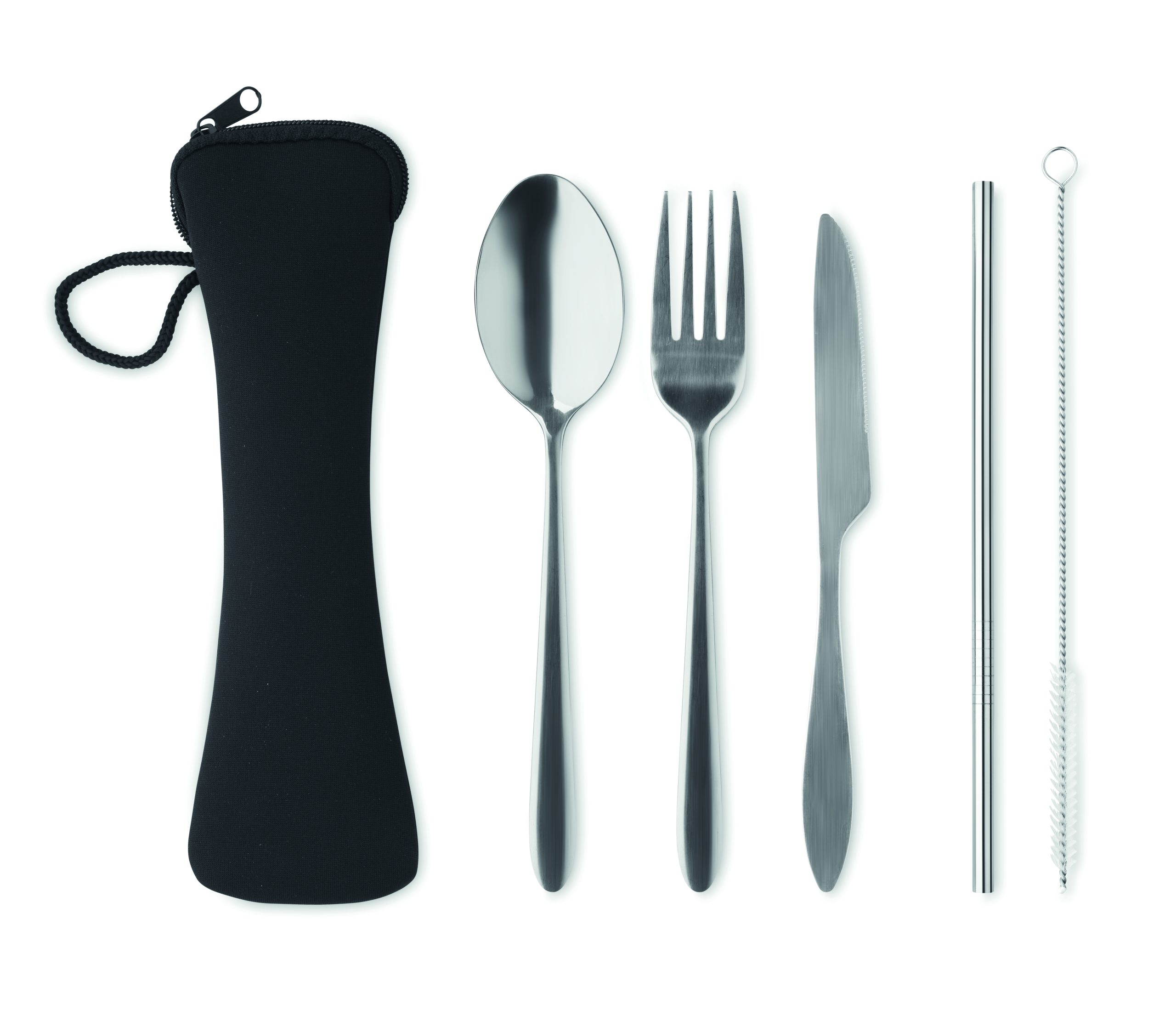 Re-usable stainless steel cutlery set including fork, knife, spoon, straw and brush in neoprene pouch.