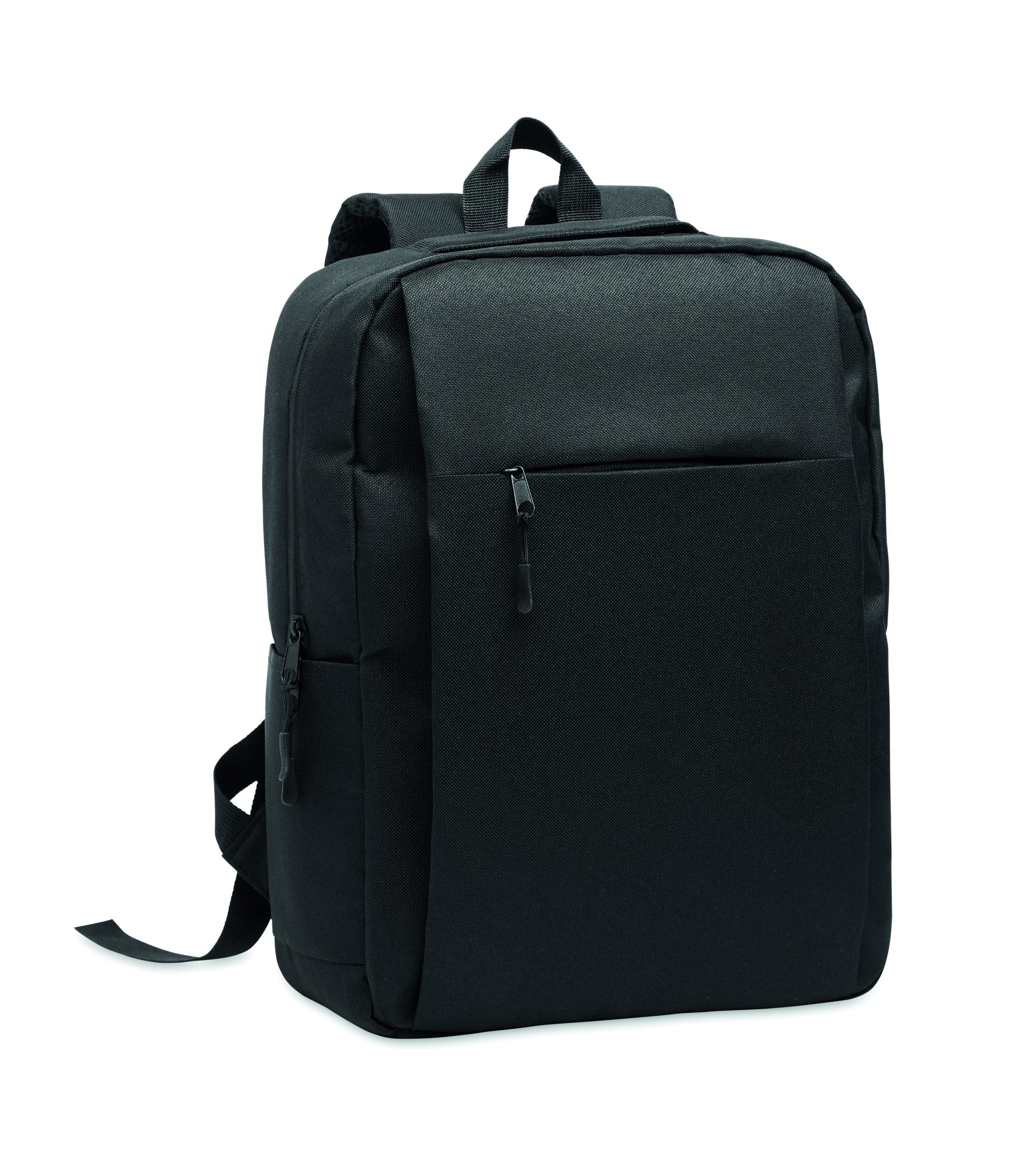 Slim backpack in 600D RPET polyester and 210D lining. Has 15 inch laptop compartment, a 10 inch tablet outside zippered pocket, 2 internal pockets, 2 internal pen pockets, zippered front pocket. 2 side pockets. Soft padded back and shoulder straps. Suitcase sleeve.