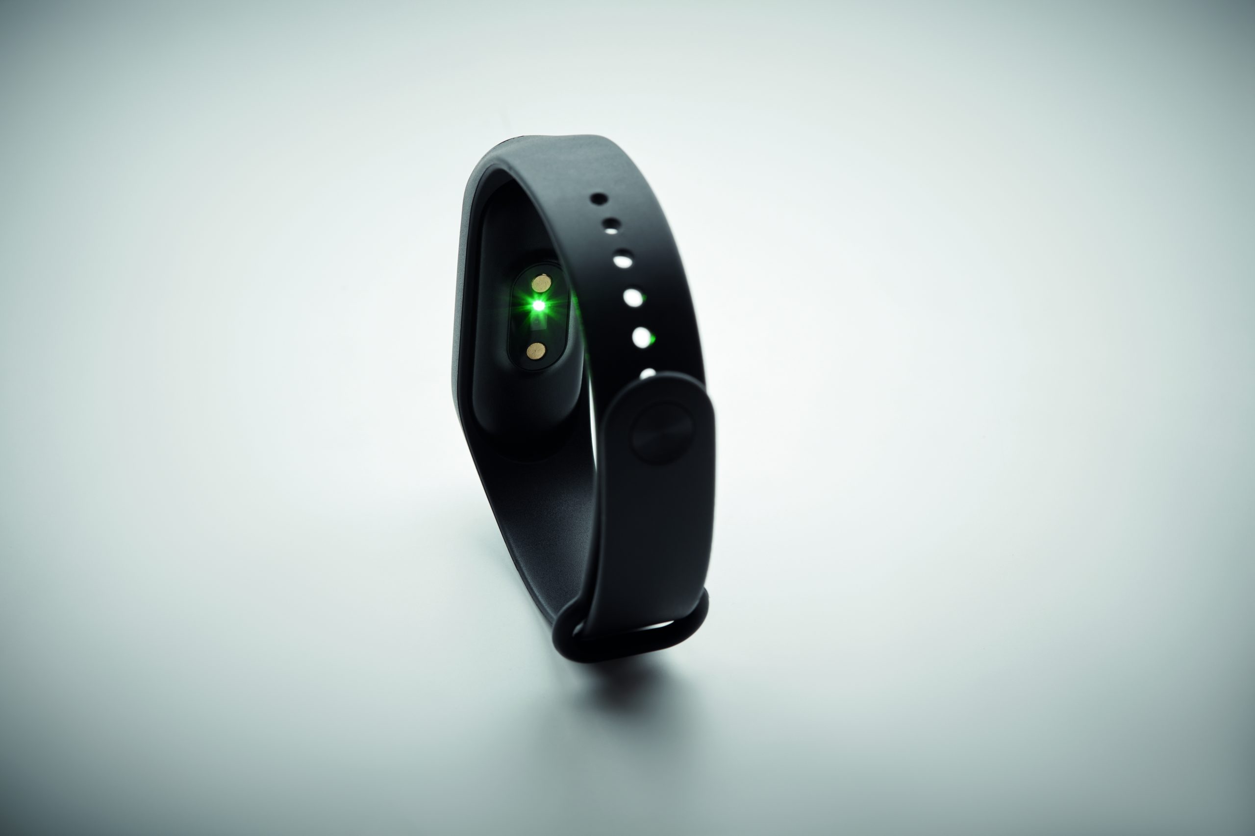 5.0 wireless smart health watch in ABS with silicone strap. 0.96 inch touch LCD display. Rechargeable Li-Pol 90 mAh battery. Requires a free app (HryFine available in both iOS and Android).