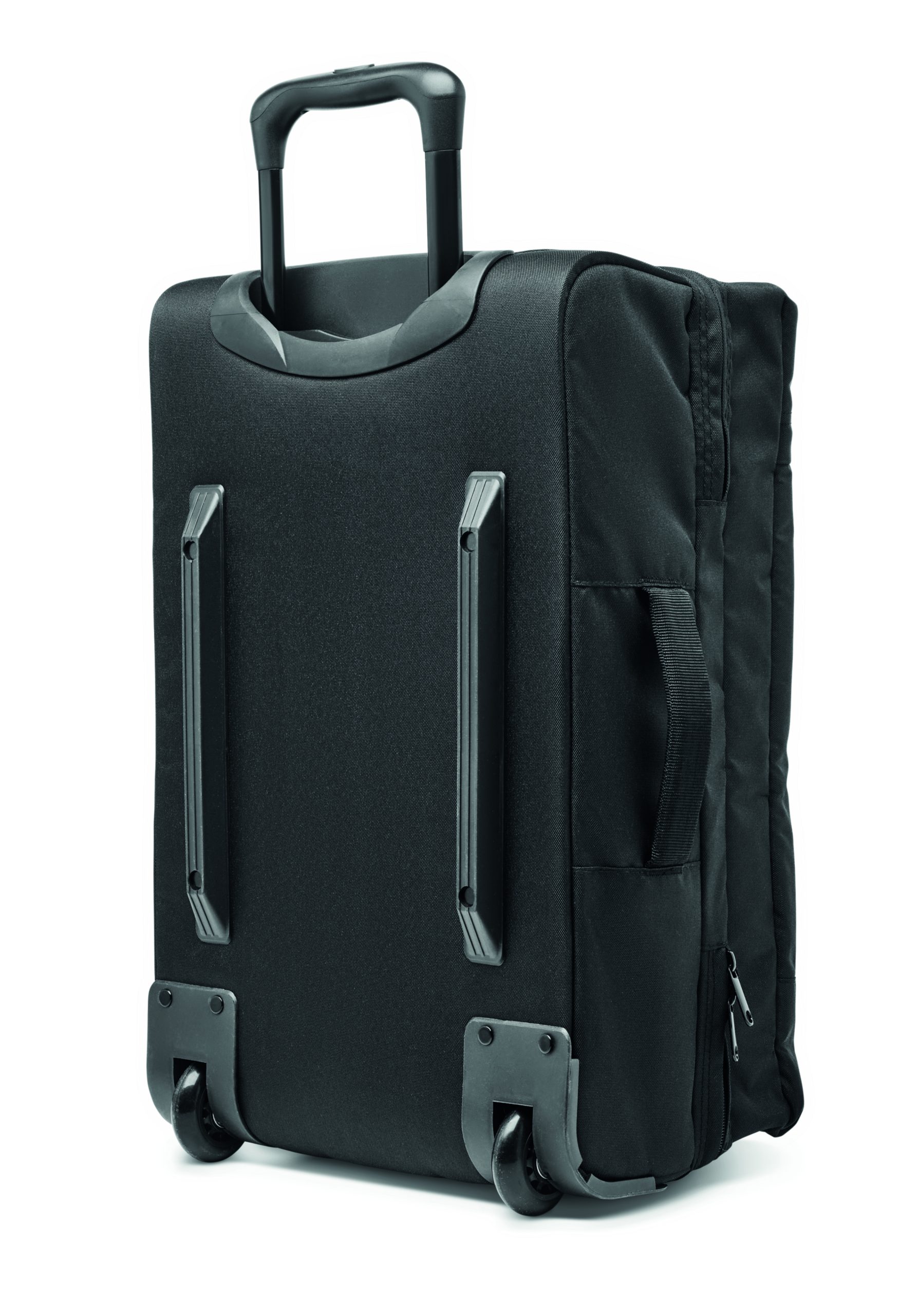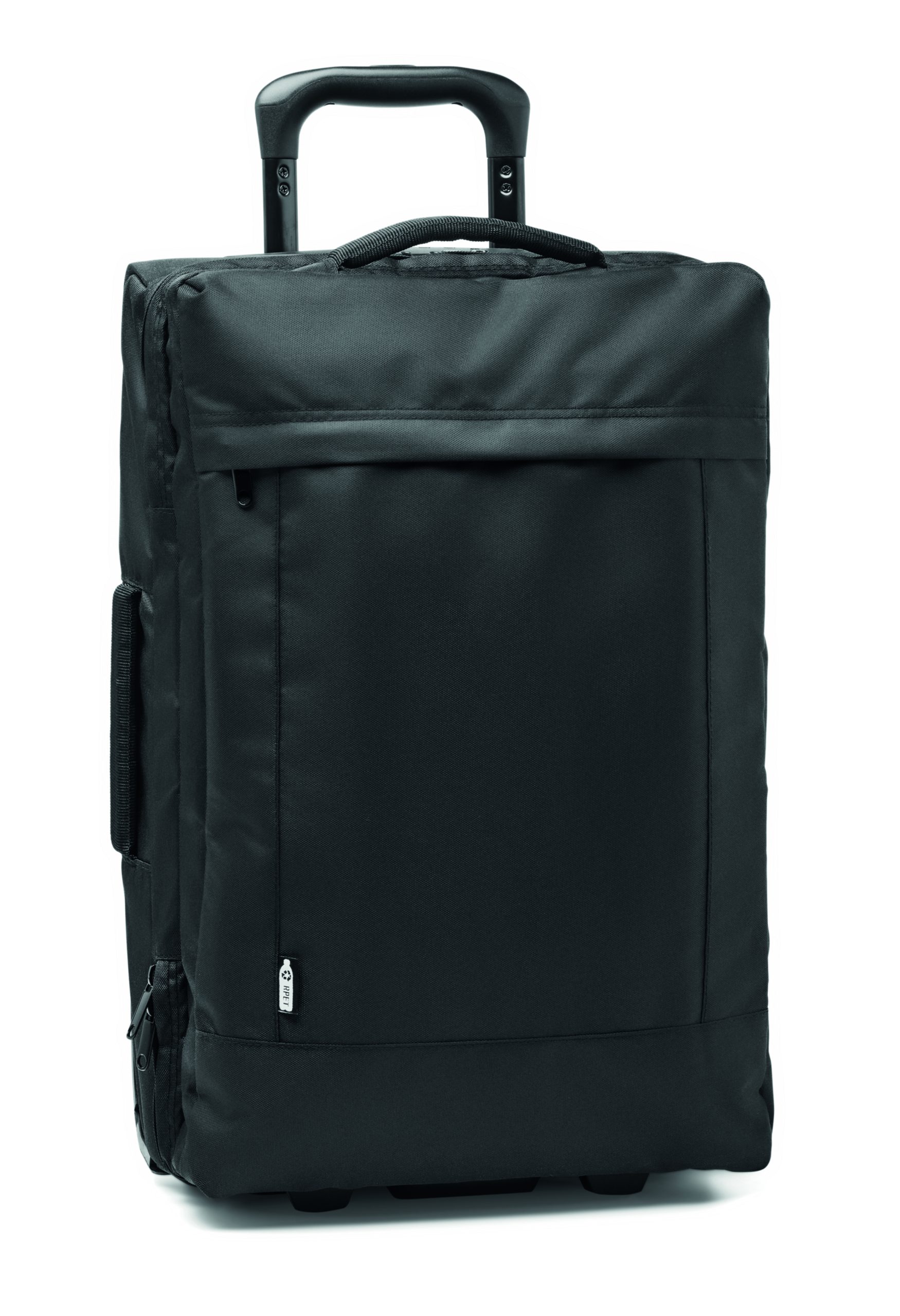 600D RPET polyester soft side trolley. Two large zippered inner compartments. One zippered front pocket and side and top handle. Including a combination lock and double tube frame. 2 wheels.