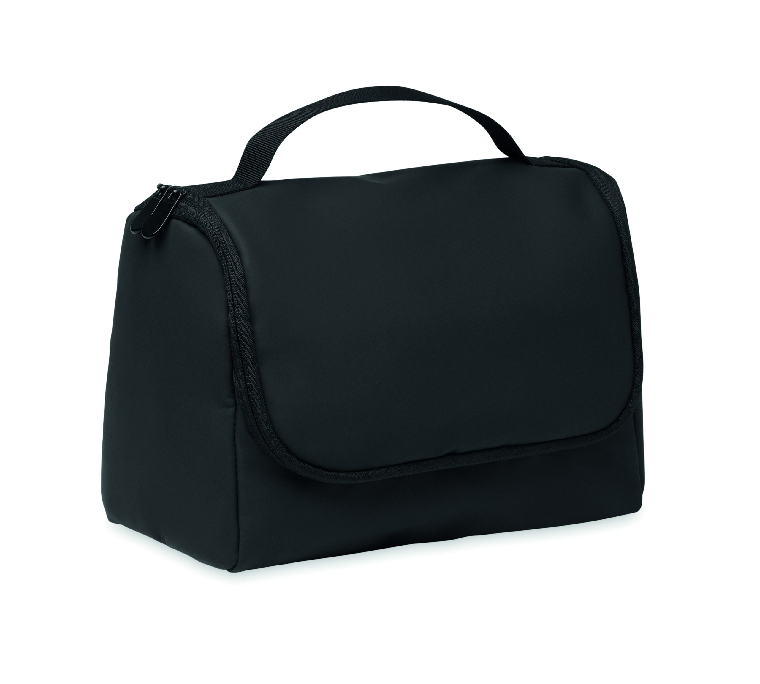 Cosmetic organiser bag in soft PU with hanging hook and 210D RPET lining. One large main compartment with inner zippered mesh compartment and 1 mesh compartment.