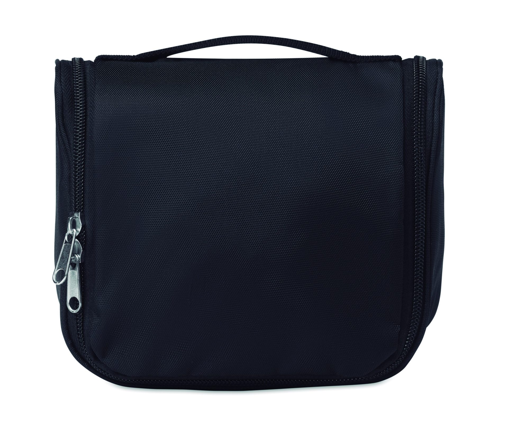 Hanging cosmetic bag with multi-compartments and mesh pockets in high density polyester. Ideal when travelling.