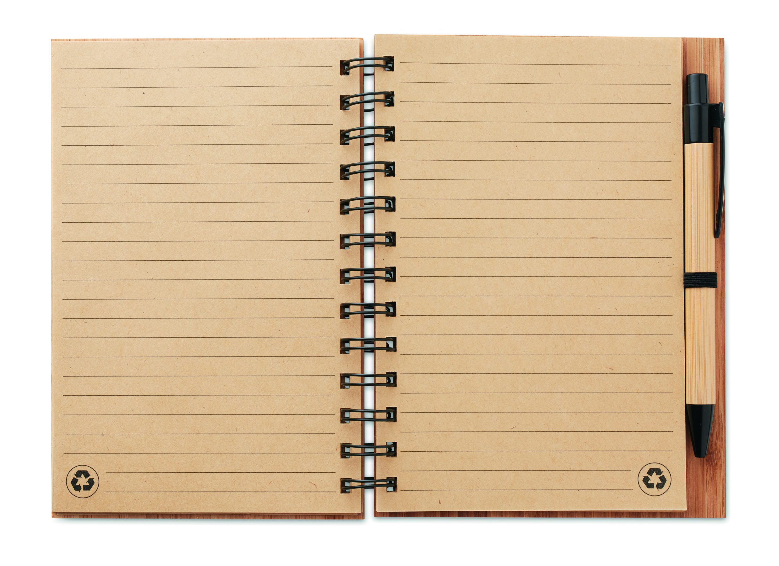 Bamboo cover notebook with matching pen. Twin-wire. 140 lined recycled paper pages (70 sheets). Matching push button ball pen with bamboo barrel and ABS details. Elastic pen holder. Bamboo is a natural product, there may be slight variations in colour and size per item, which can affect the final decoration outcome. FSC®-certified | FSC 100%, N5.7, FSC-C213206