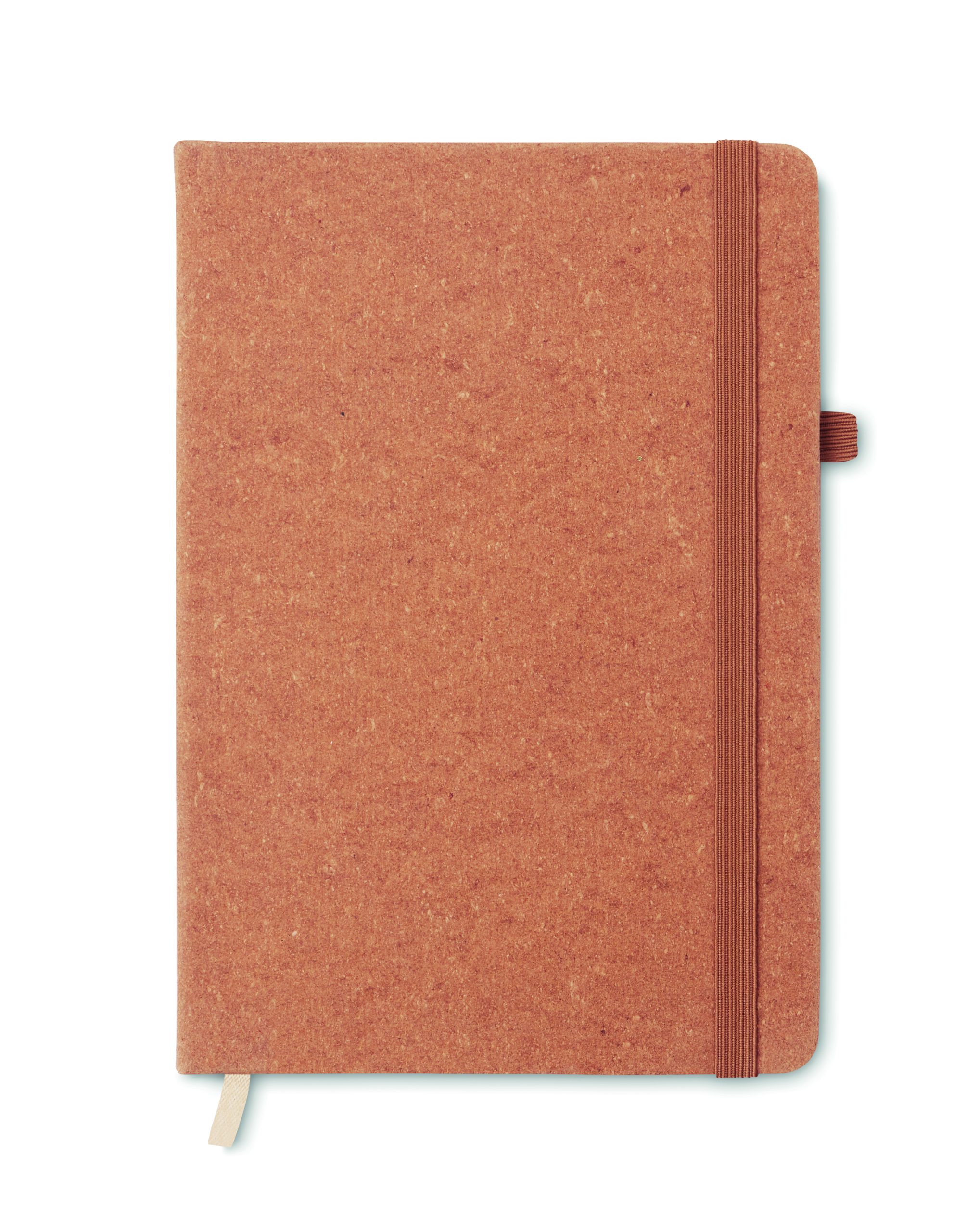 A5 notebook with 70% recycled pre-consumer leather and 30% latex PU cover. Casebound. 160 lined pages recycled paper (80 sheets). Matching elastic closure strap and pen holder.