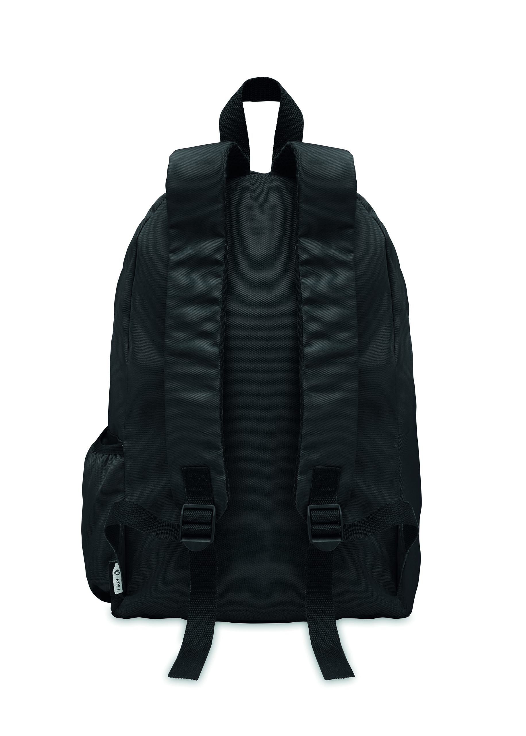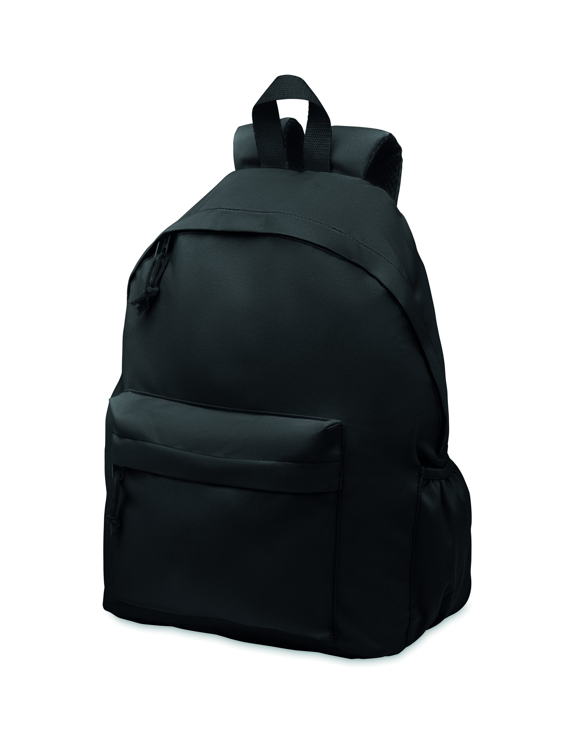 Backpack in 600D RPET polyester with outside pocket with zipper. Padded back and has a side bottle compartment.