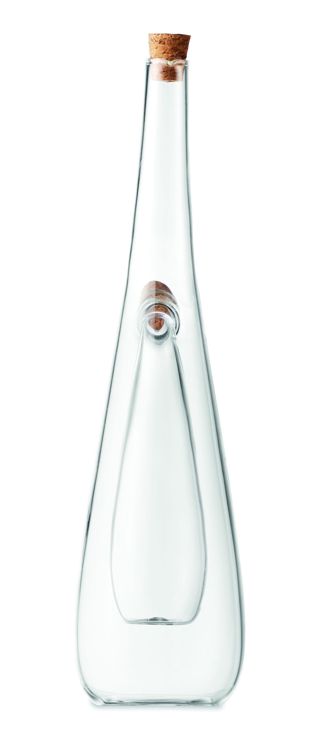 Borosilicate glass oil and vinegar bottle with cork stoppers. Capacity outer: 300 ml. Capacity inner: 80 ml. Cork is 100% natural material. Due to its structural nature and surface porosity the final print result per item may have deviations.