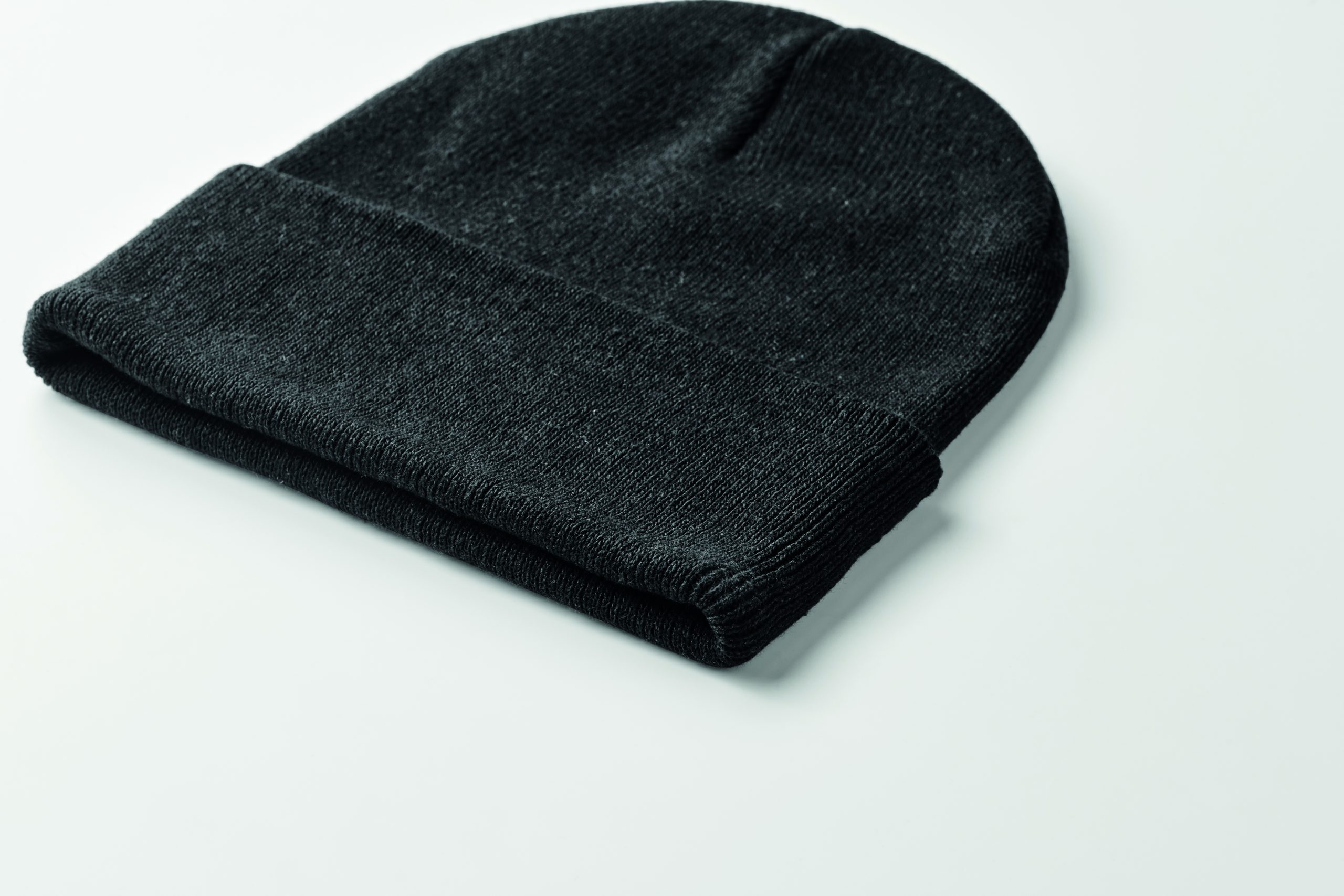 Unisex knitted beanie hat in soft stretchable polyester (64%) and acrylic (36%) with rolled up cuff. A stretchy one-size-fits-all design.