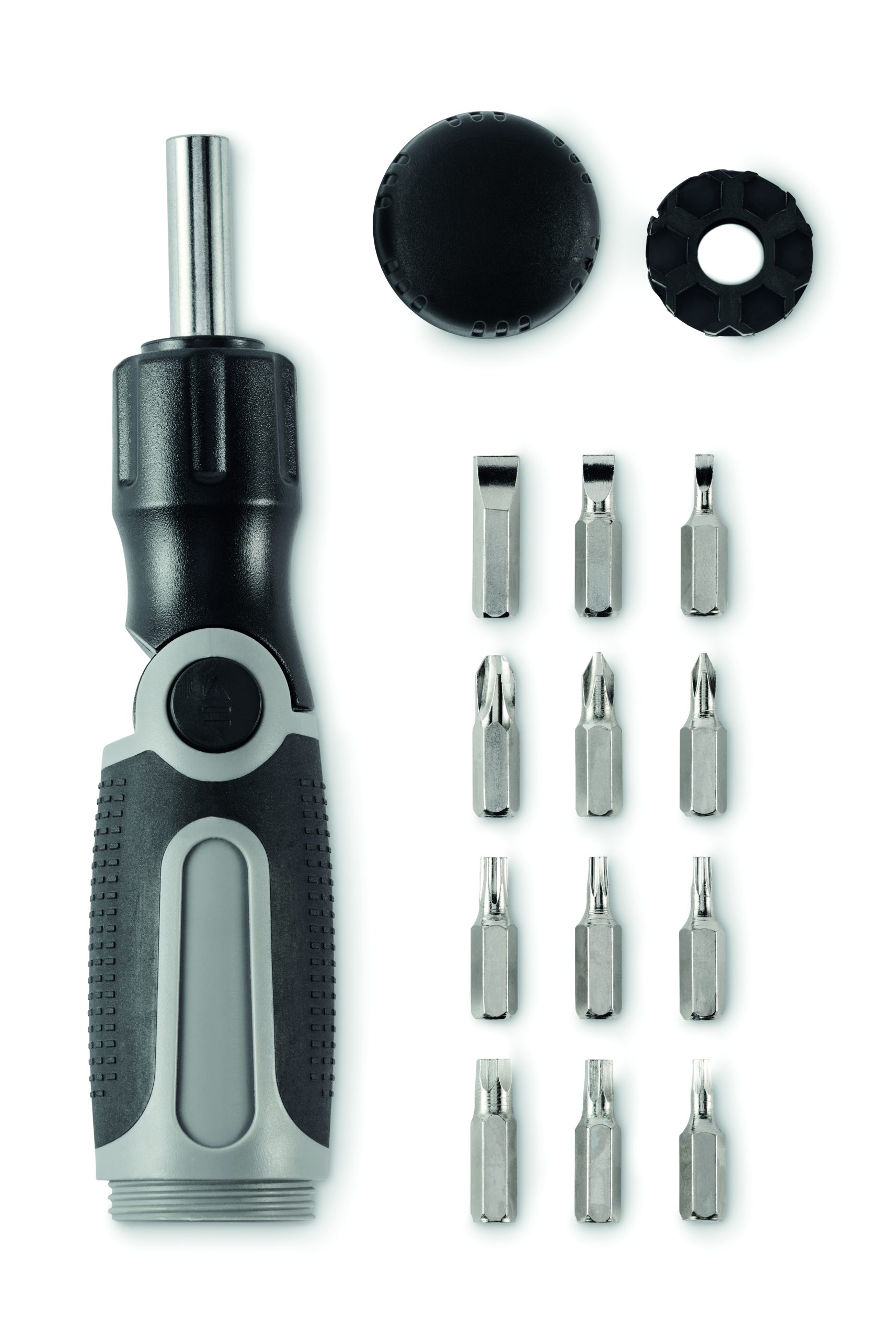 Bendable screwdriver set with ABS handle and 12 iron bits including Phillips, flat head, hex and torx types.