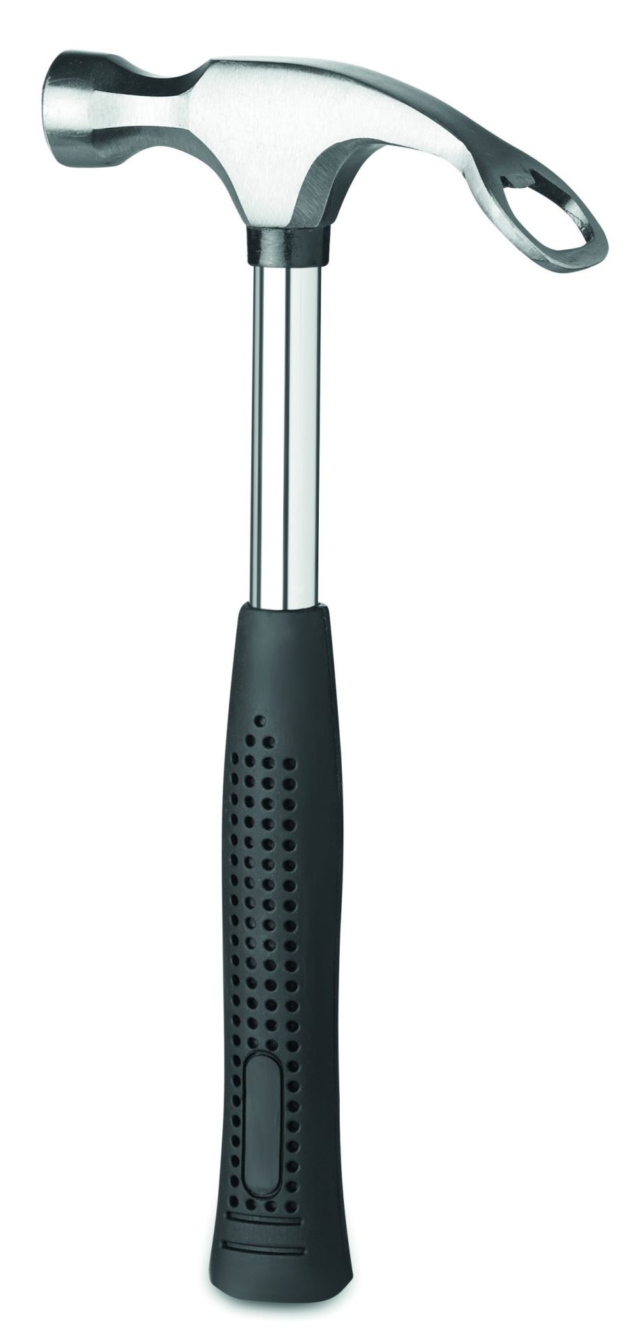 Hammer and bottle opener made of carbon steel. Handle in TPR thermoplastic rubber.