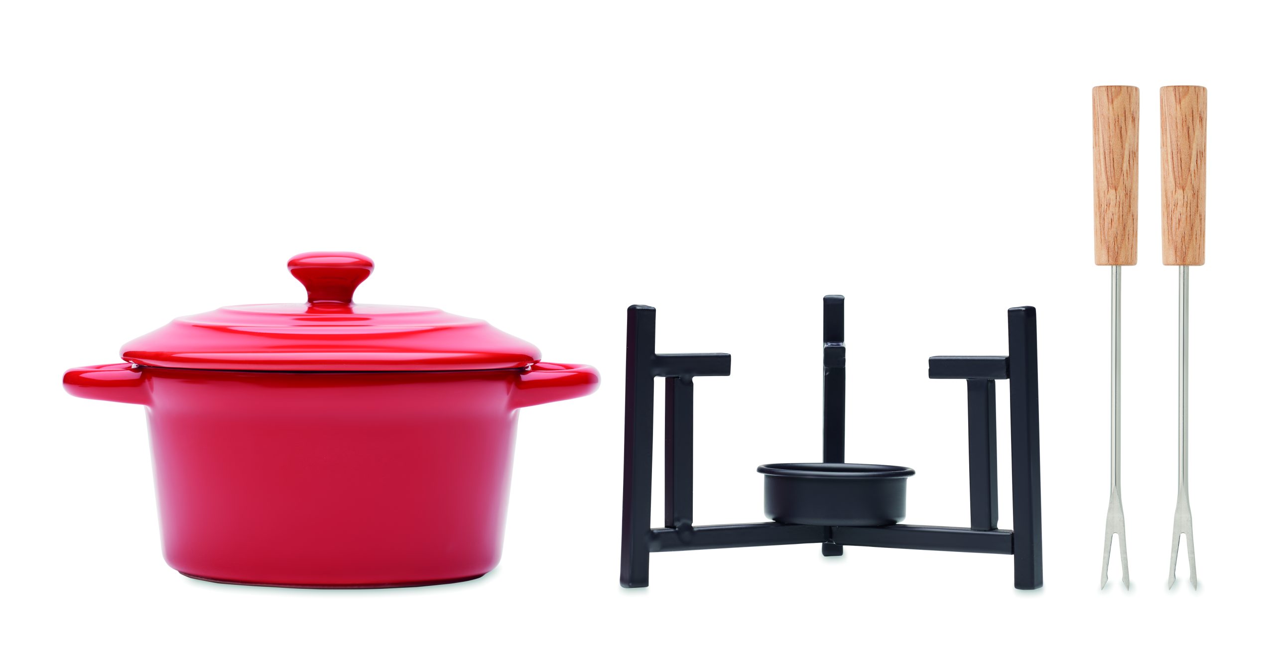 Small ceramic fondue set with lid for two. Including 2 metal forks wit wooden handles. Tea light not included. Capacity: 300 ml.