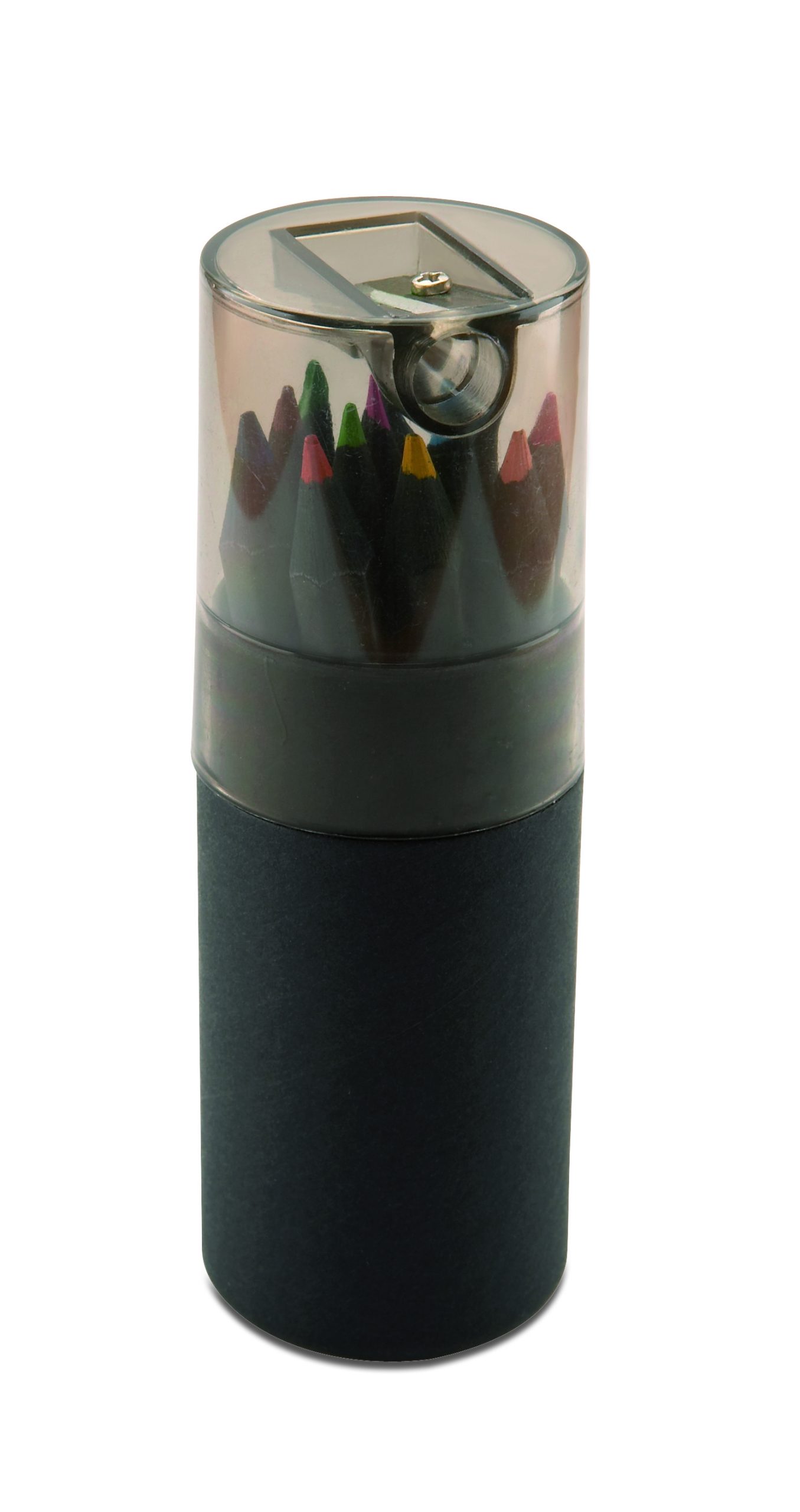 This black coloured paper tube box contains 12 colouring pencils and a pencil sharpener in the lid of the box. FSC®-certified | FSC 100%, P5.1, W17.2, FSC-C213206