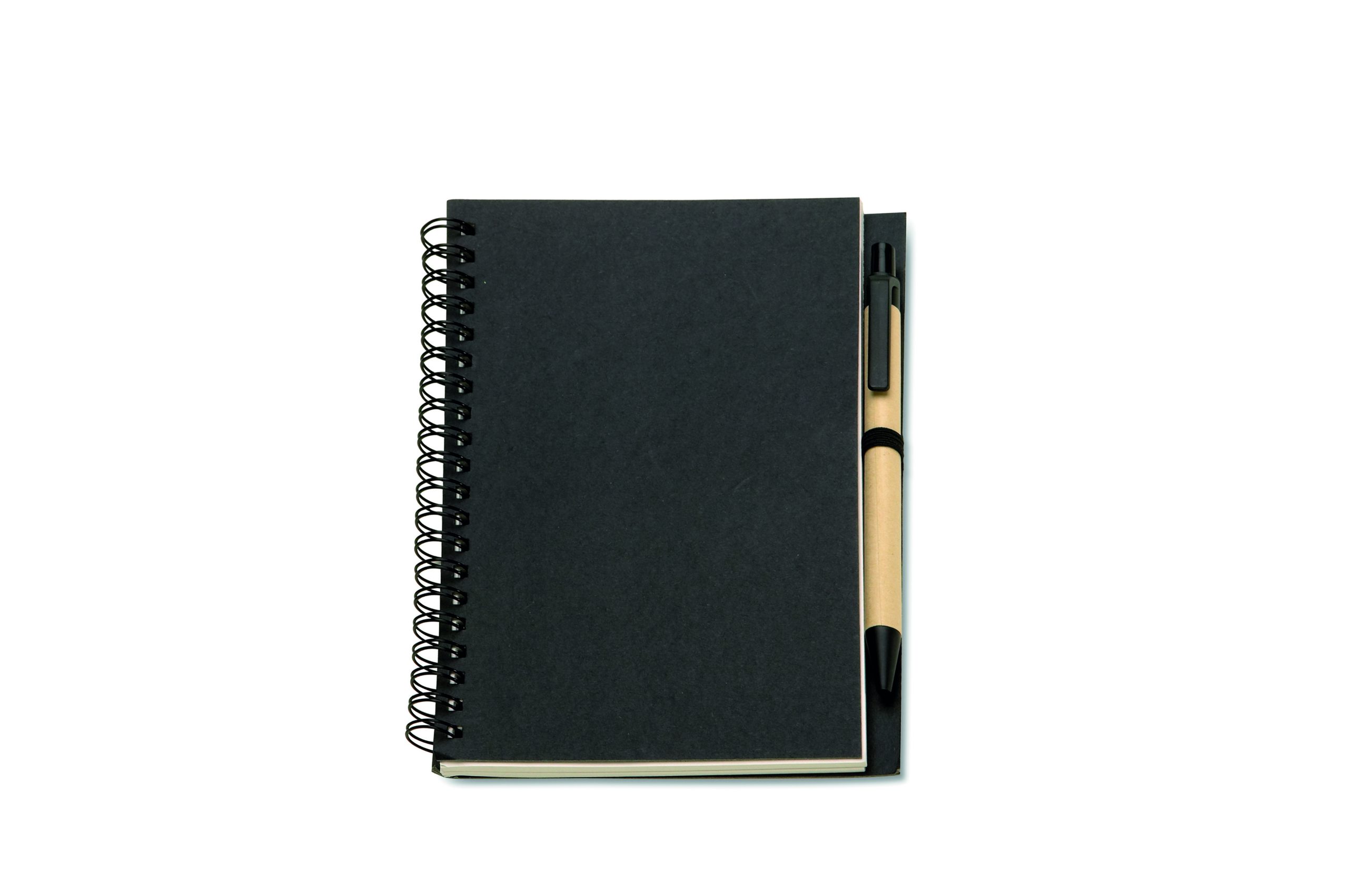 Recycled paper notebook with pen. Twin-wire. 140 plain recycled paper pages (70 sheets). Push button ball pen in recycled carton and biodegradable plastic. Blue ink. Black elastic pen holder. FSC MIX CREDIT | P7.1 | FSC-C213206