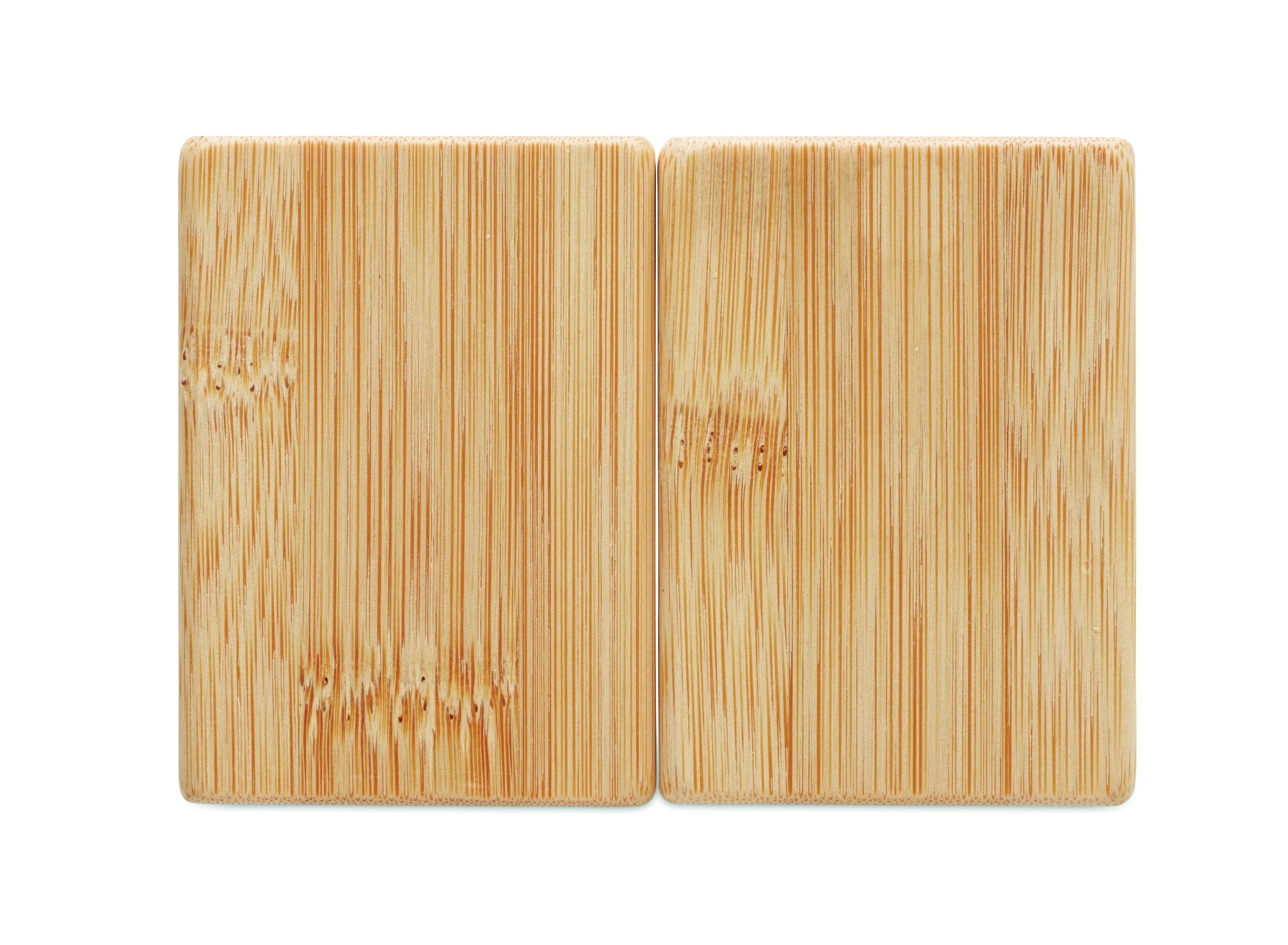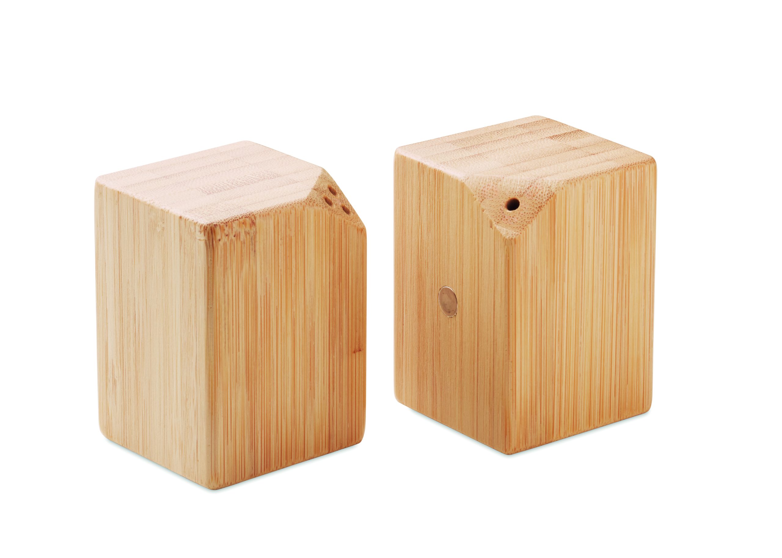 Magnetic bamboo salt and pepper set with PP plug closure at the base. The two shakers connect magnetically.