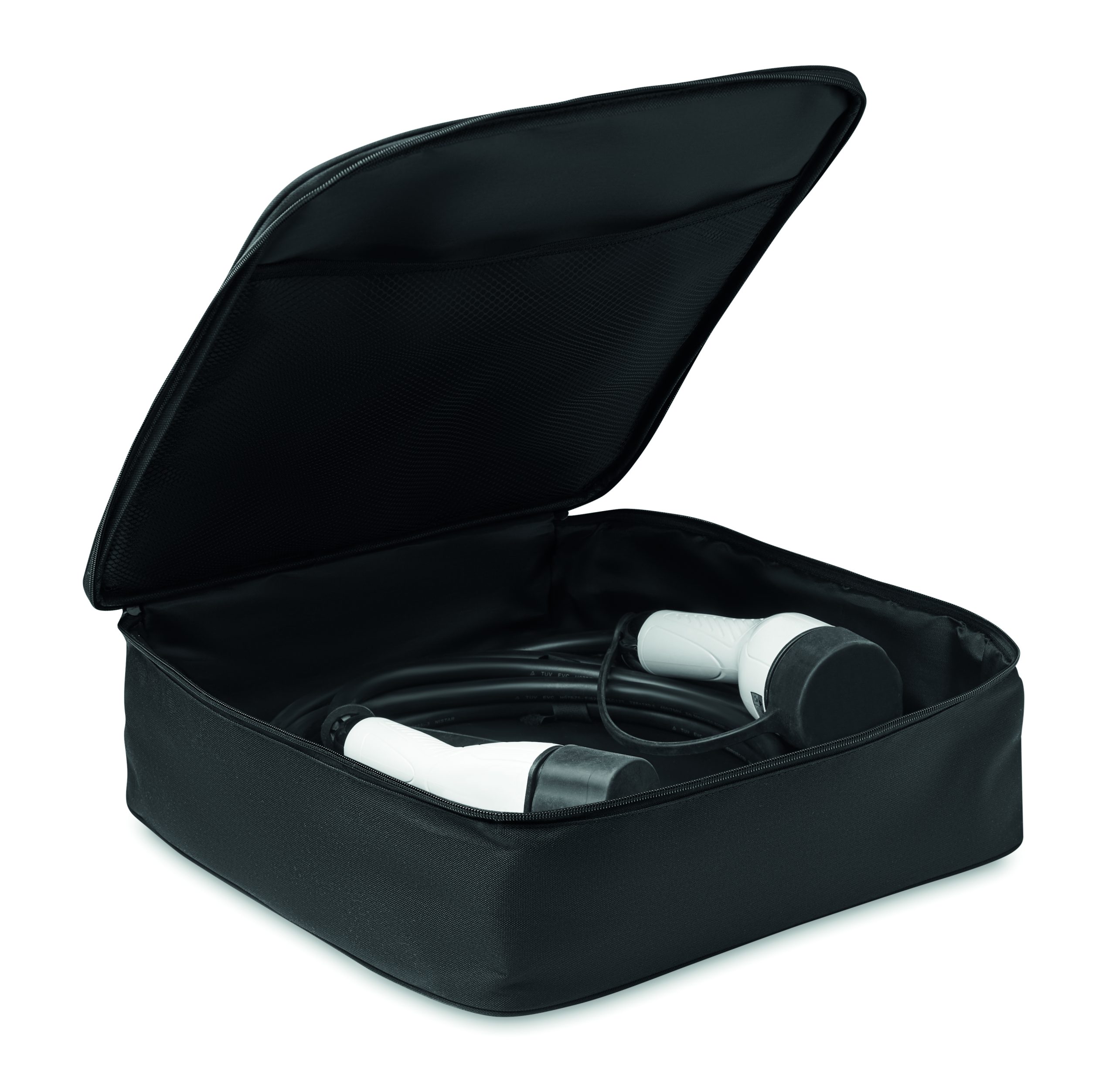 Durable padded charging cable storage bag in 600D RPET with mesh inner compartments for on-board electric cars.