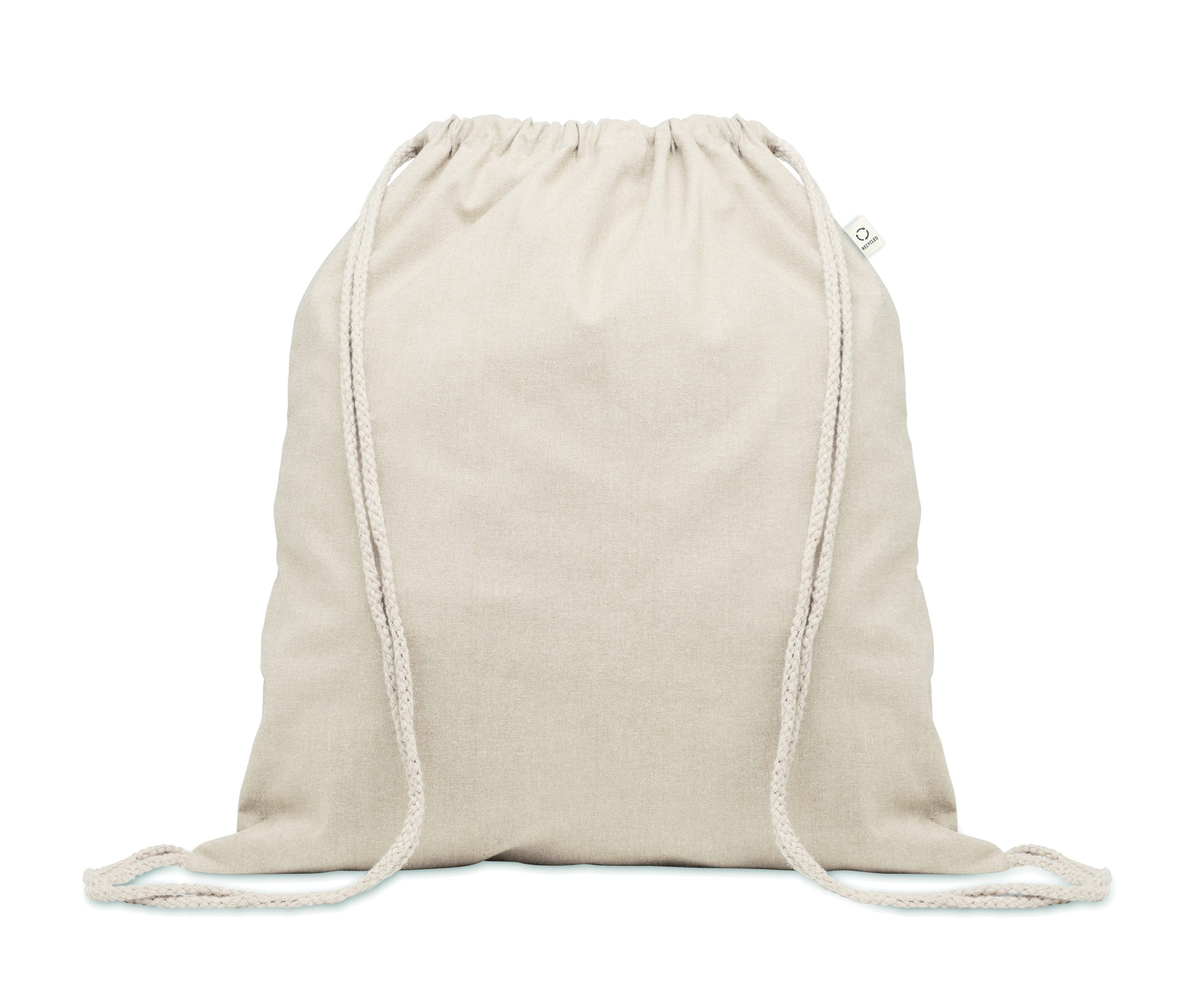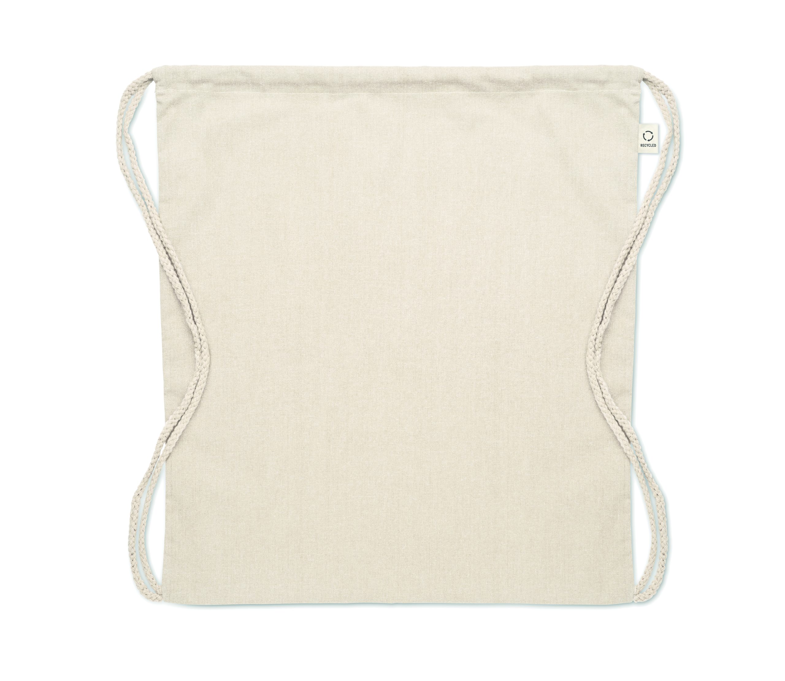 Drawstring bag in recycled pre-consumer cotton (70 %) and RPET (30%) 140 gr/m². This item can shrink after printing.