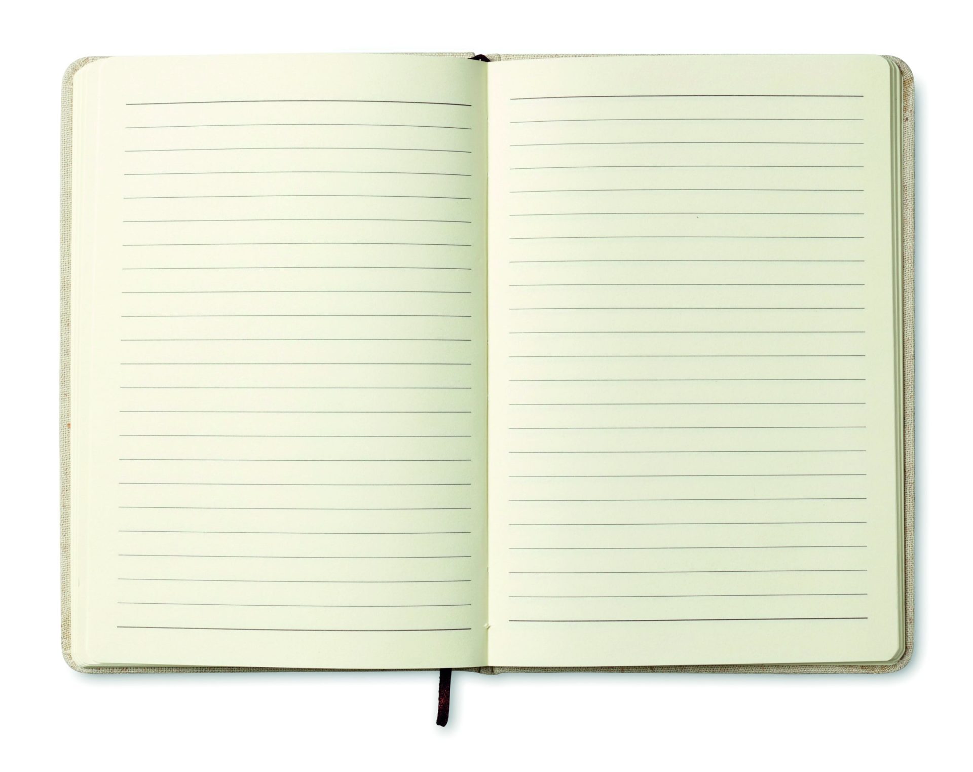 A5 notebook with hard canvas cover. Casebound. 192 lined recycled paper pages (96 sheets). Contrasting elastic closure strap and ribbon page-marker.