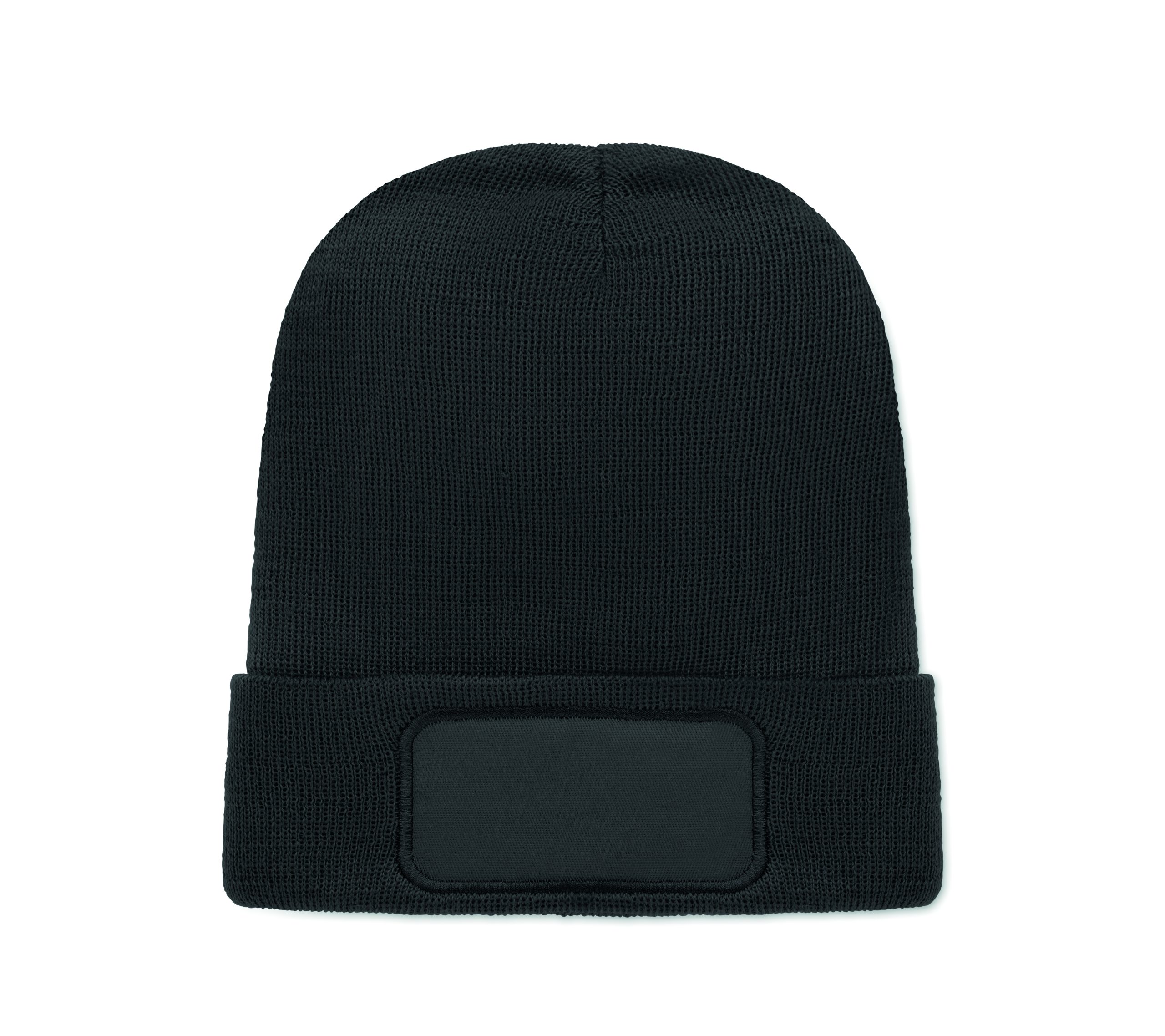 Unisex knitted beanie in soft stretchable RPET polyester with cuff and patch.