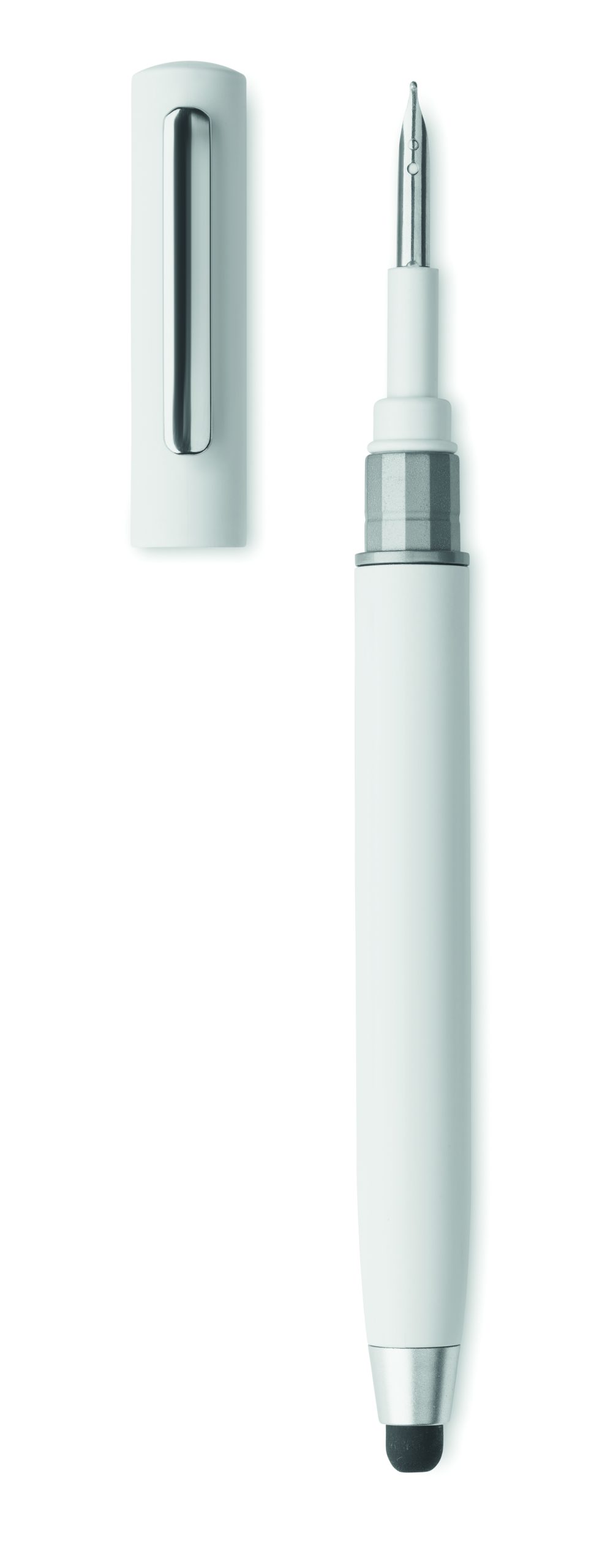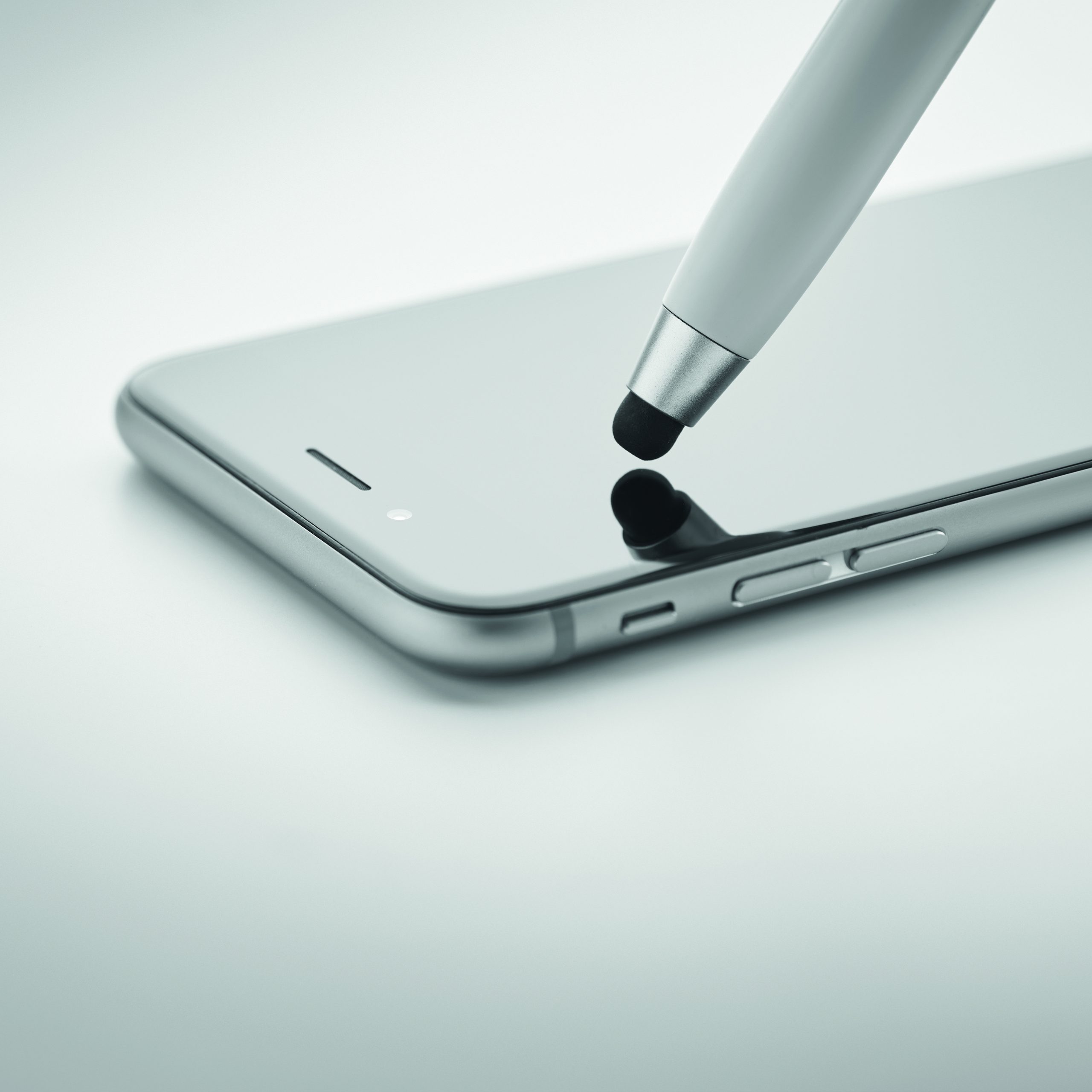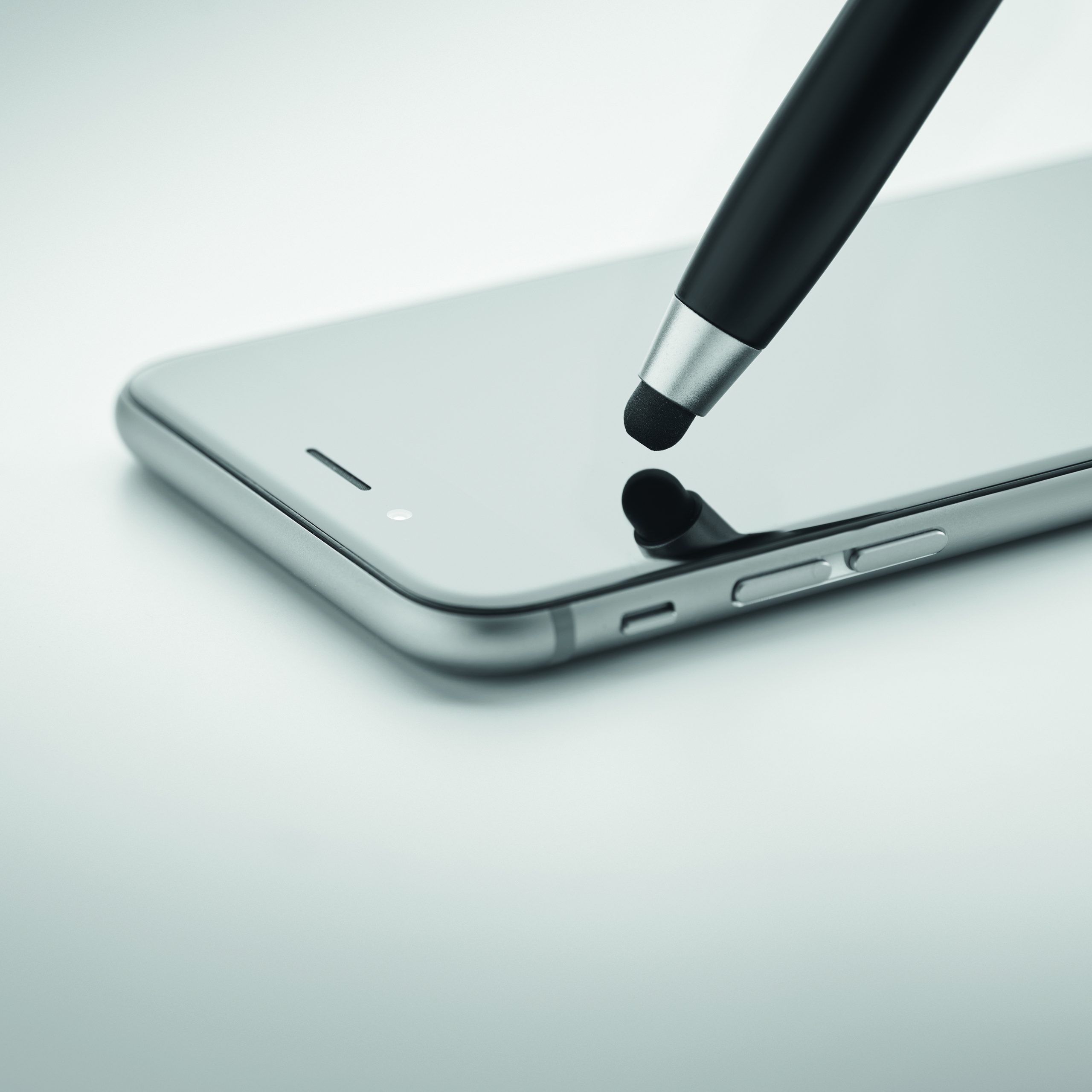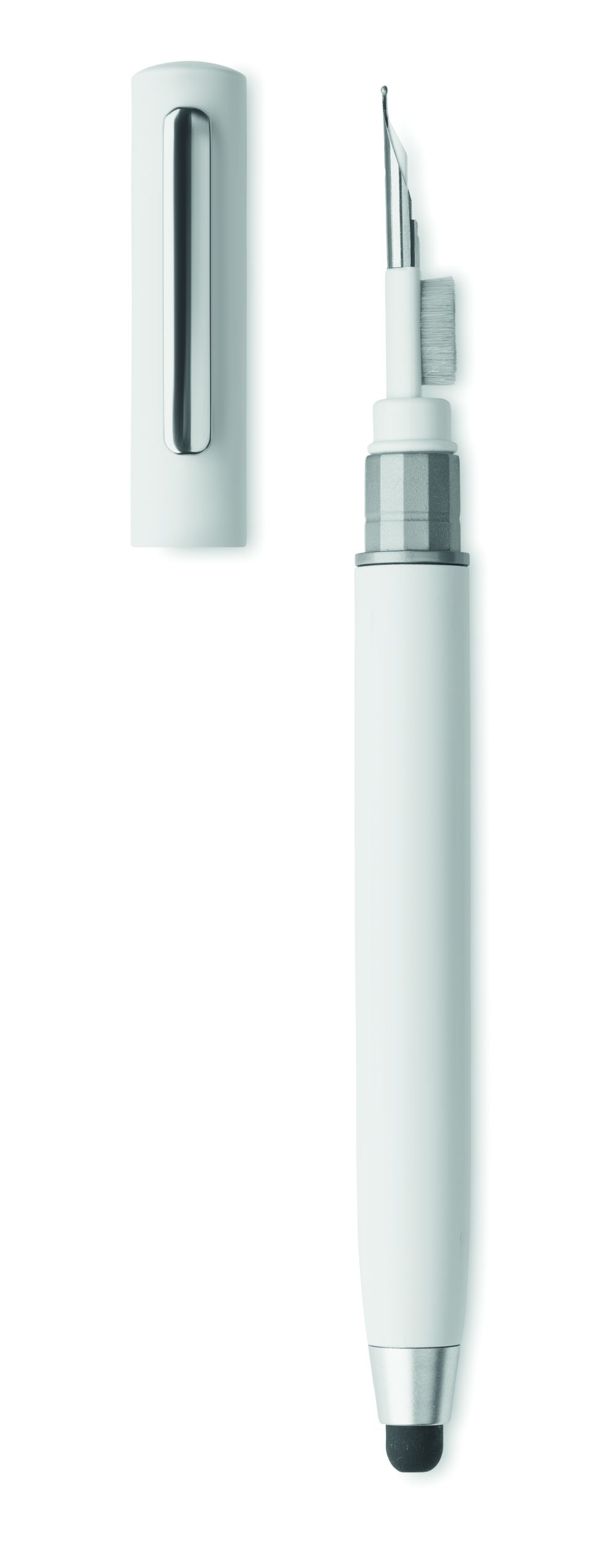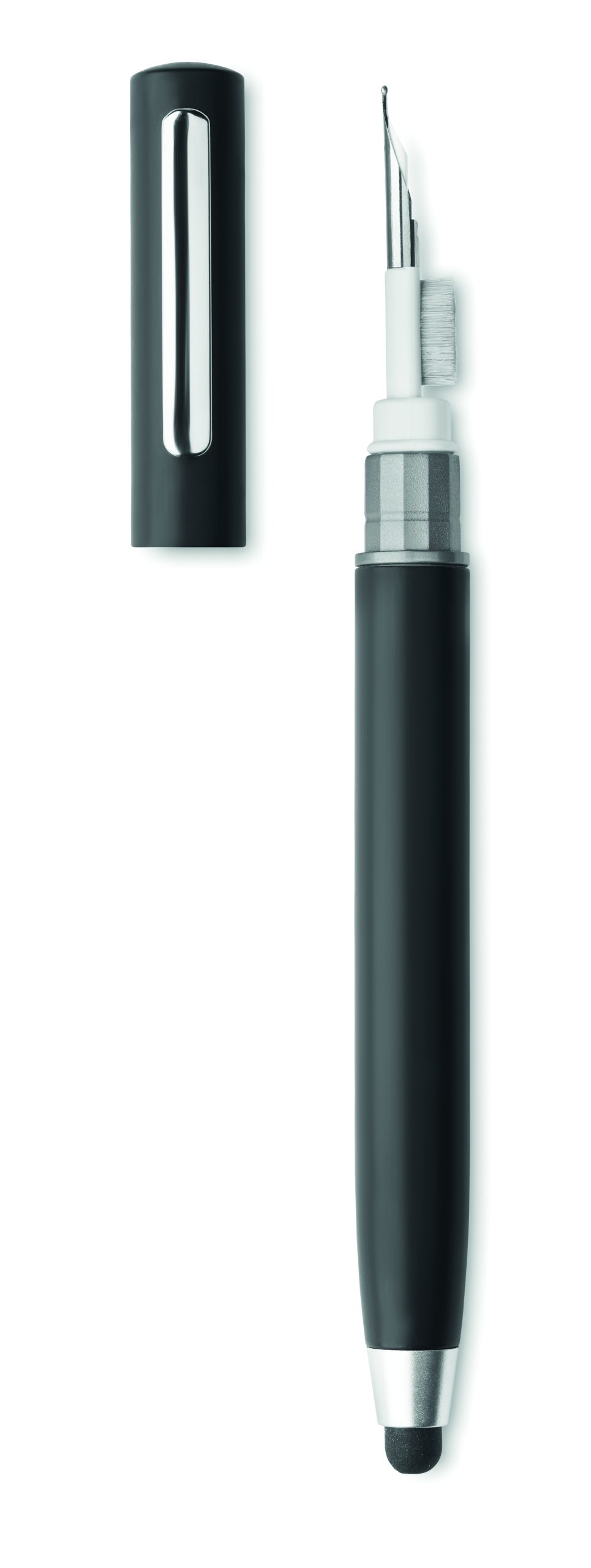 Twist action ball pen with stylus in ABS. It has a True Wireless Stereo (TWS) earbud cleaning kit: metal nib, sponge and brush. Blue ink.