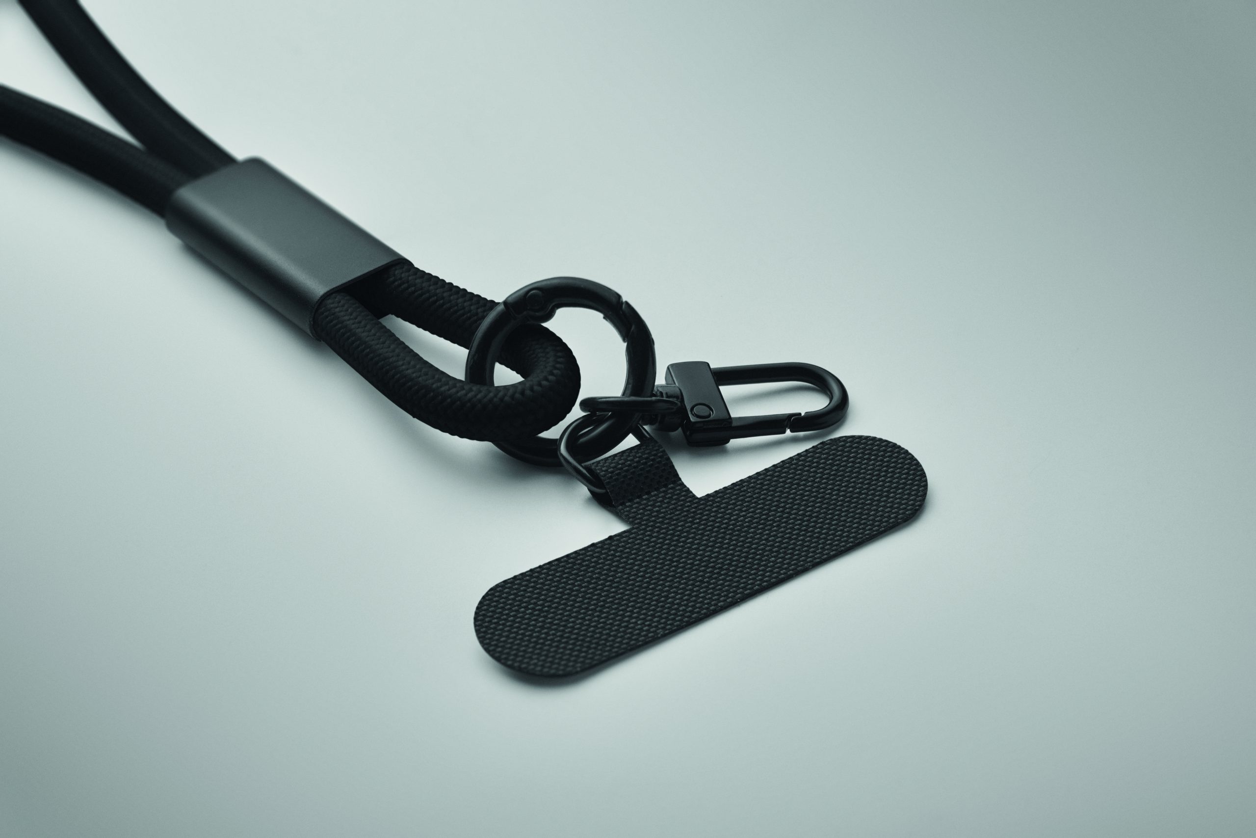 Cord lanyard with 60W charging and data transfer cable type-C to type-C in RPET with phone cord holder and key clip.