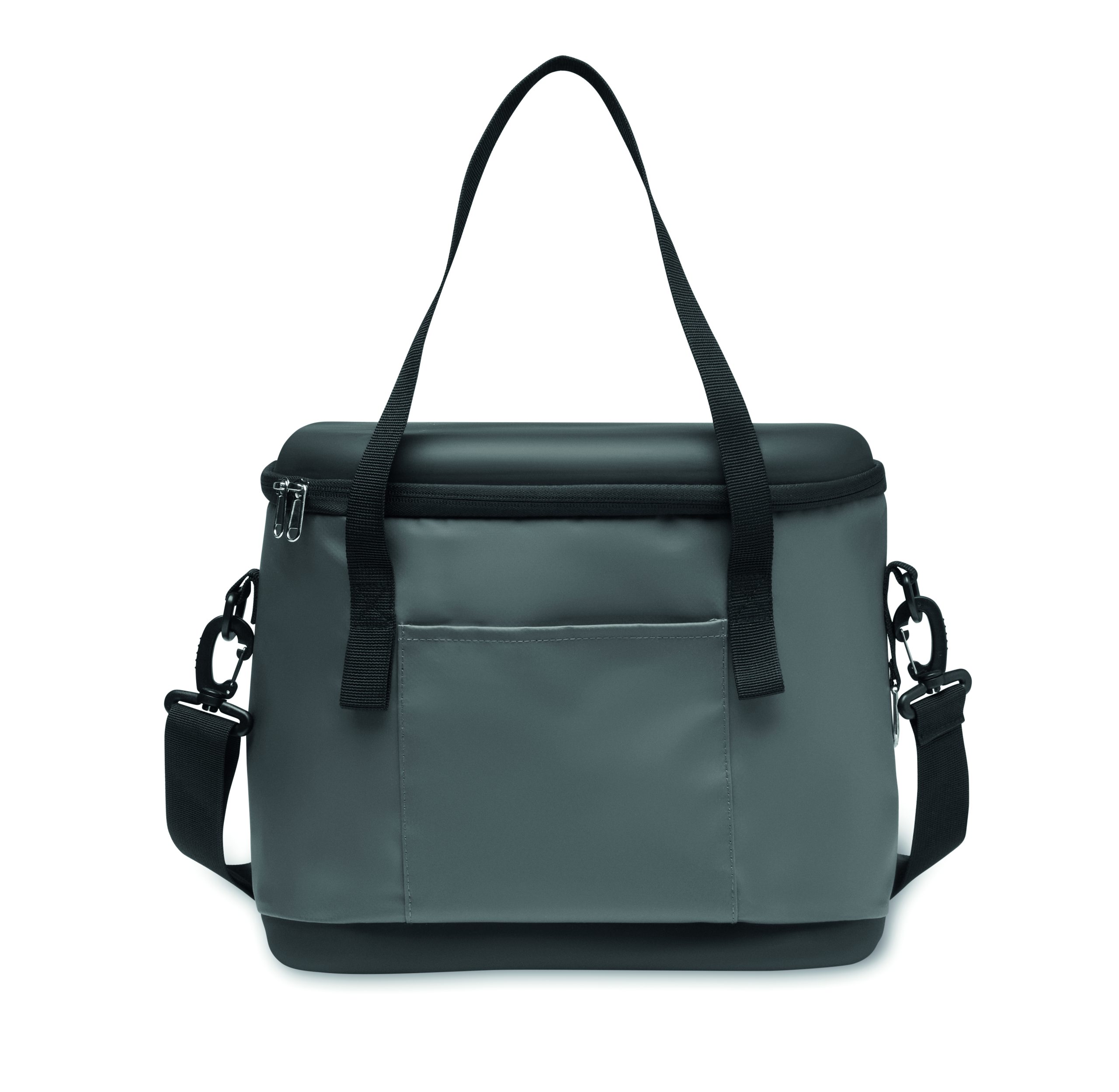 Cooler bag in 50C tarpaulin and top/bottom in rigid PEVA and bottle opener on the side. Including 1 front pocket and 1 inner mesh pocket. Isolation material: PE foam layer. Includes 2 handles and 1 adjustable and detachable strap. Capacity 16L.
