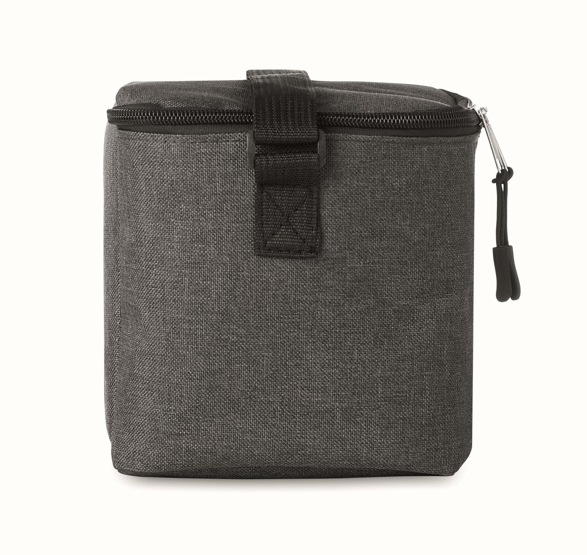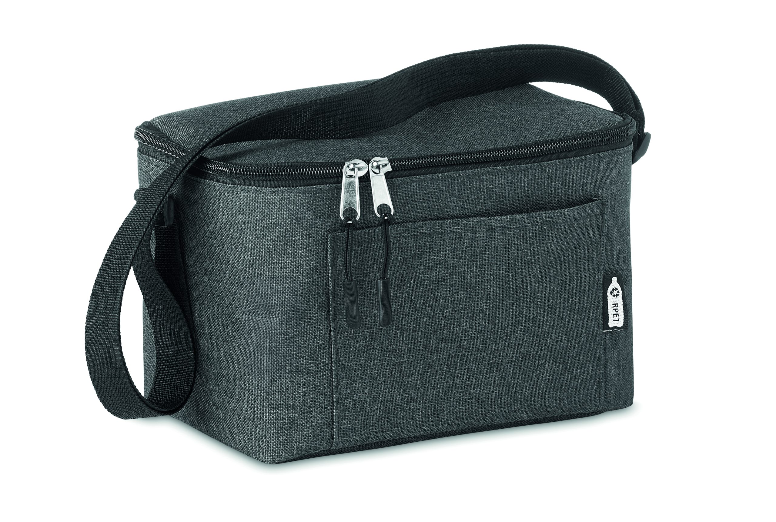 Cooler bag for 6 cans in 2 tone 600D RPET and front pocket. Capacity 3L. Isolation material: 0.15mm PEVA + 3mm foam.