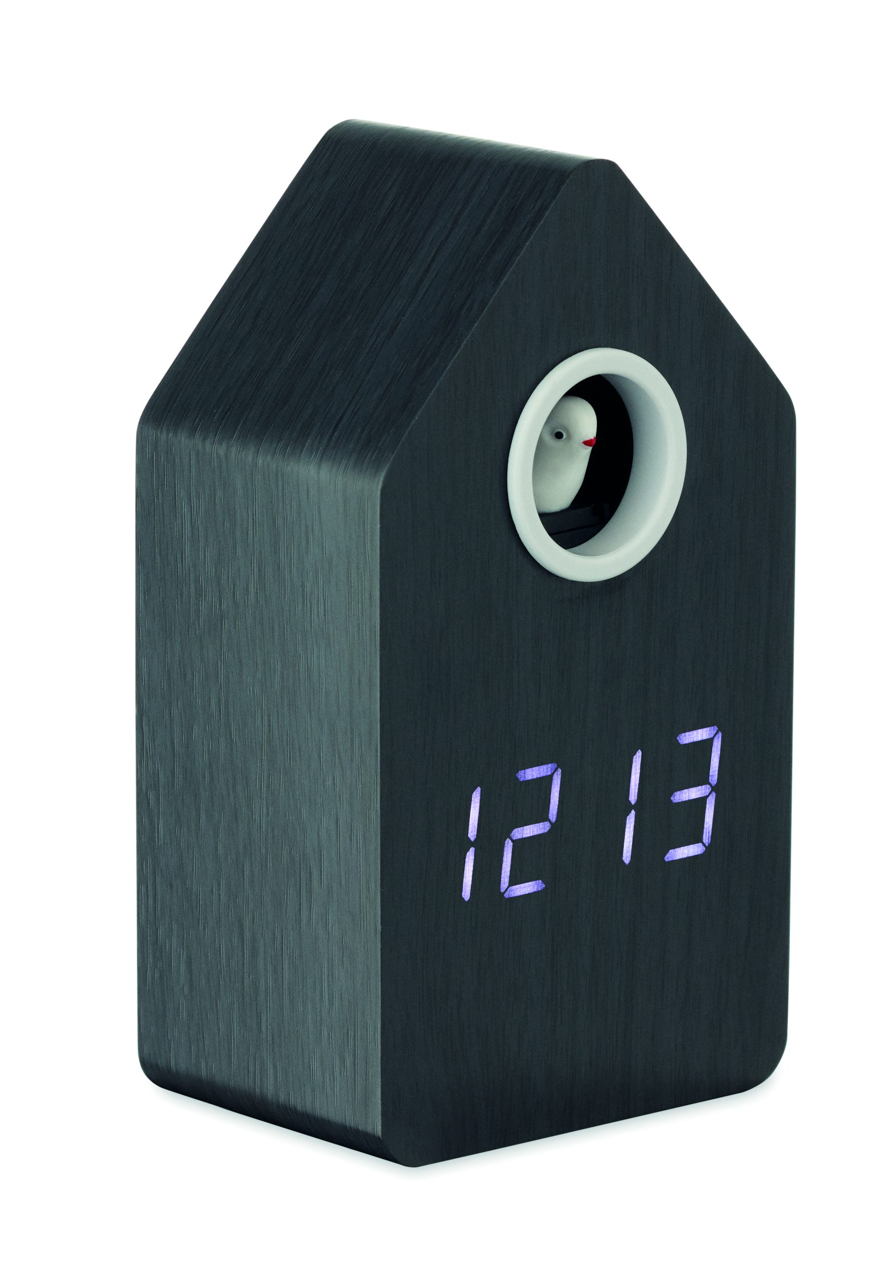 MDF cuckoo clock including a built-in alarm / temperature display. Bird will come out every full hour and during alarm and it has bird cuckoo voice. White LED display. Sound is automatically silenced between 22.00h to 06.00. 5 mins snooze intervals.
