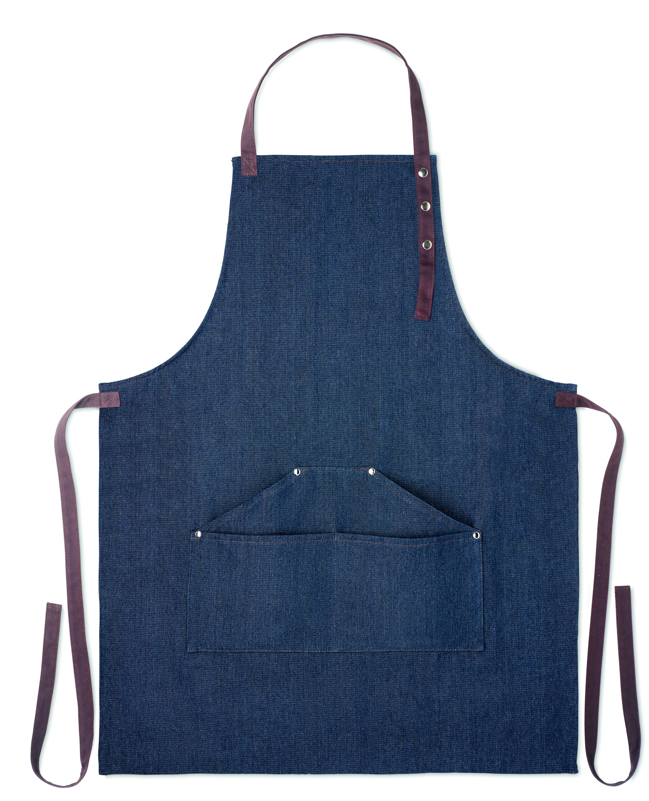 Adjustable kitchen apron with 3 front pockets in 240 gr/m² denim with cotton straps. Presented in individual box.