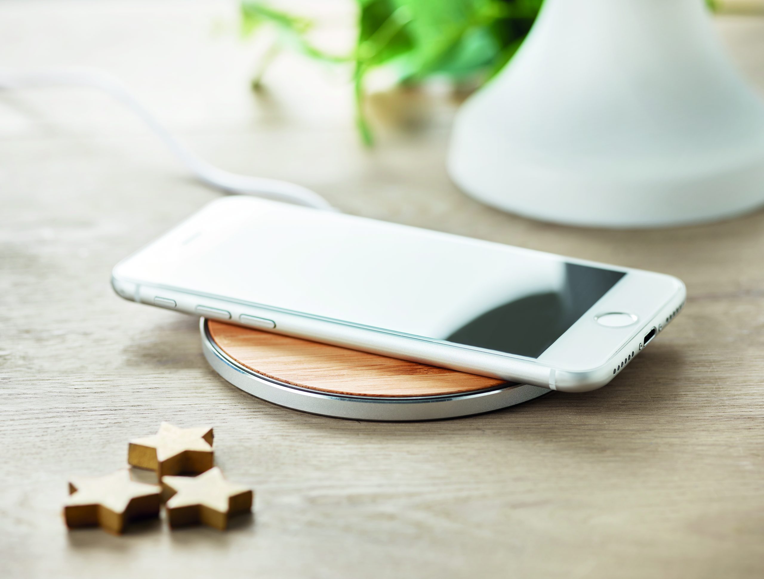 Wireless quick charger in bamboo and aluminium. Blue light lit when charging. Output: DC9V/1.1A (10W). Bamboo is a natural product, there may be slight variations in colour and size per item, which can affect the final decoration outcome.