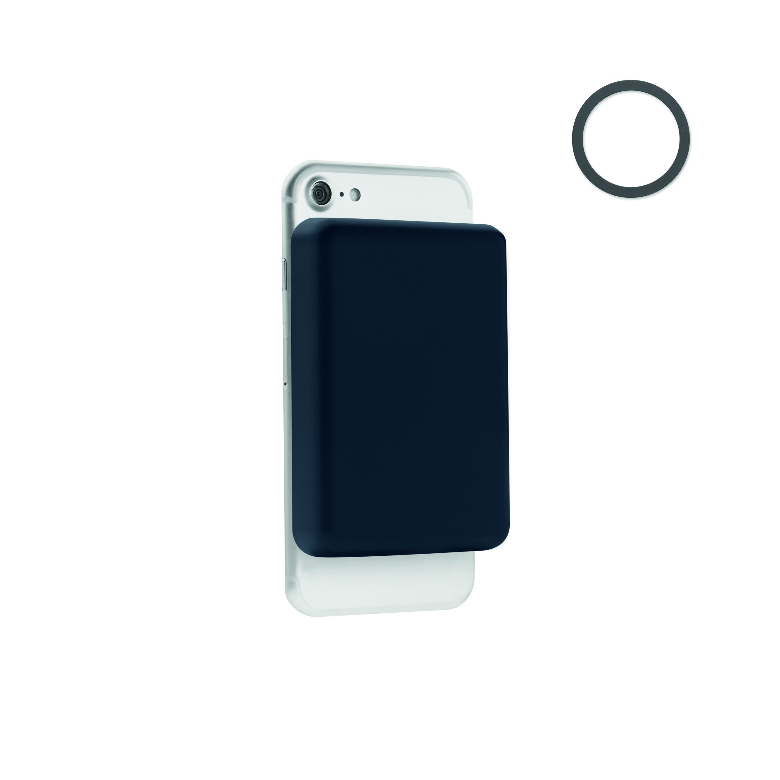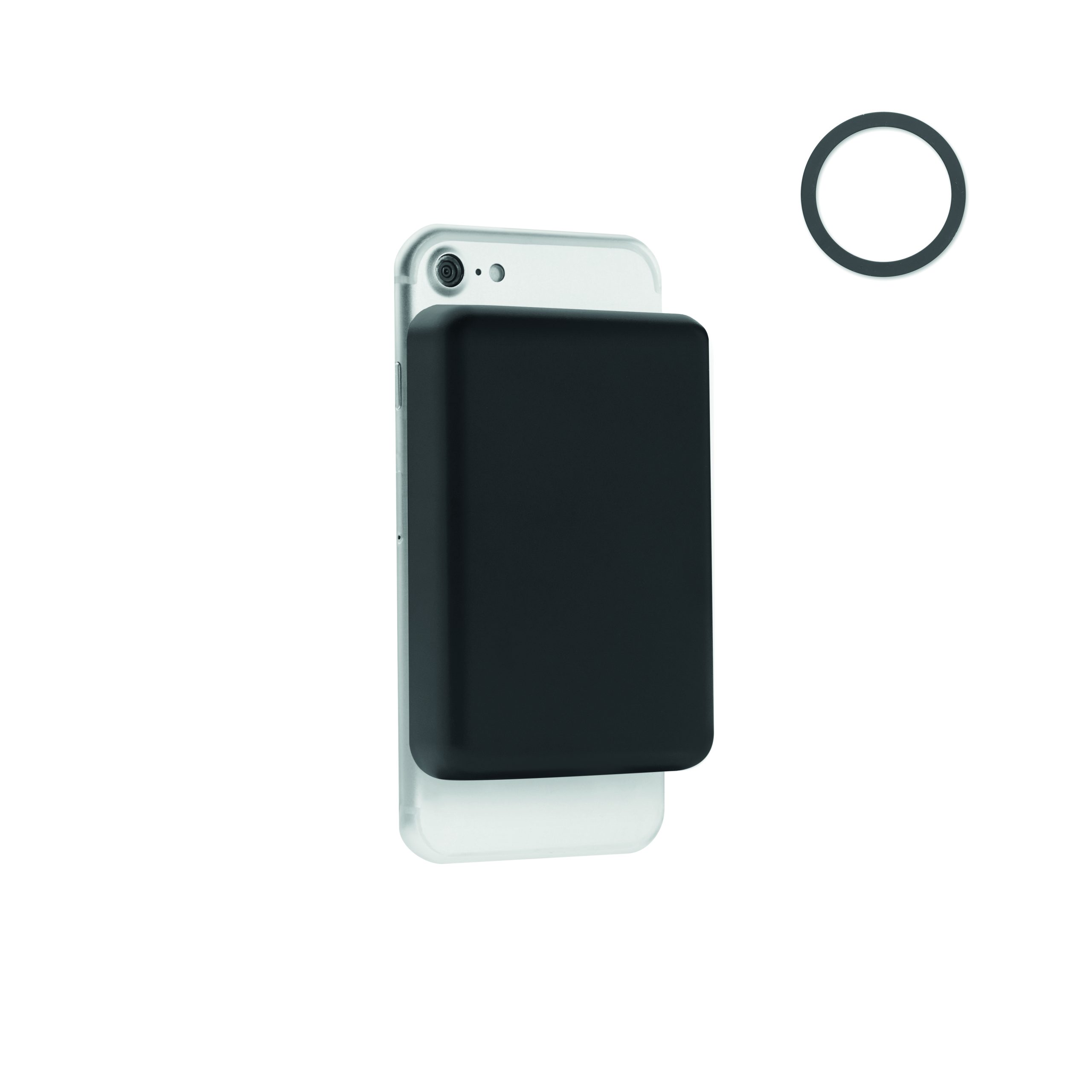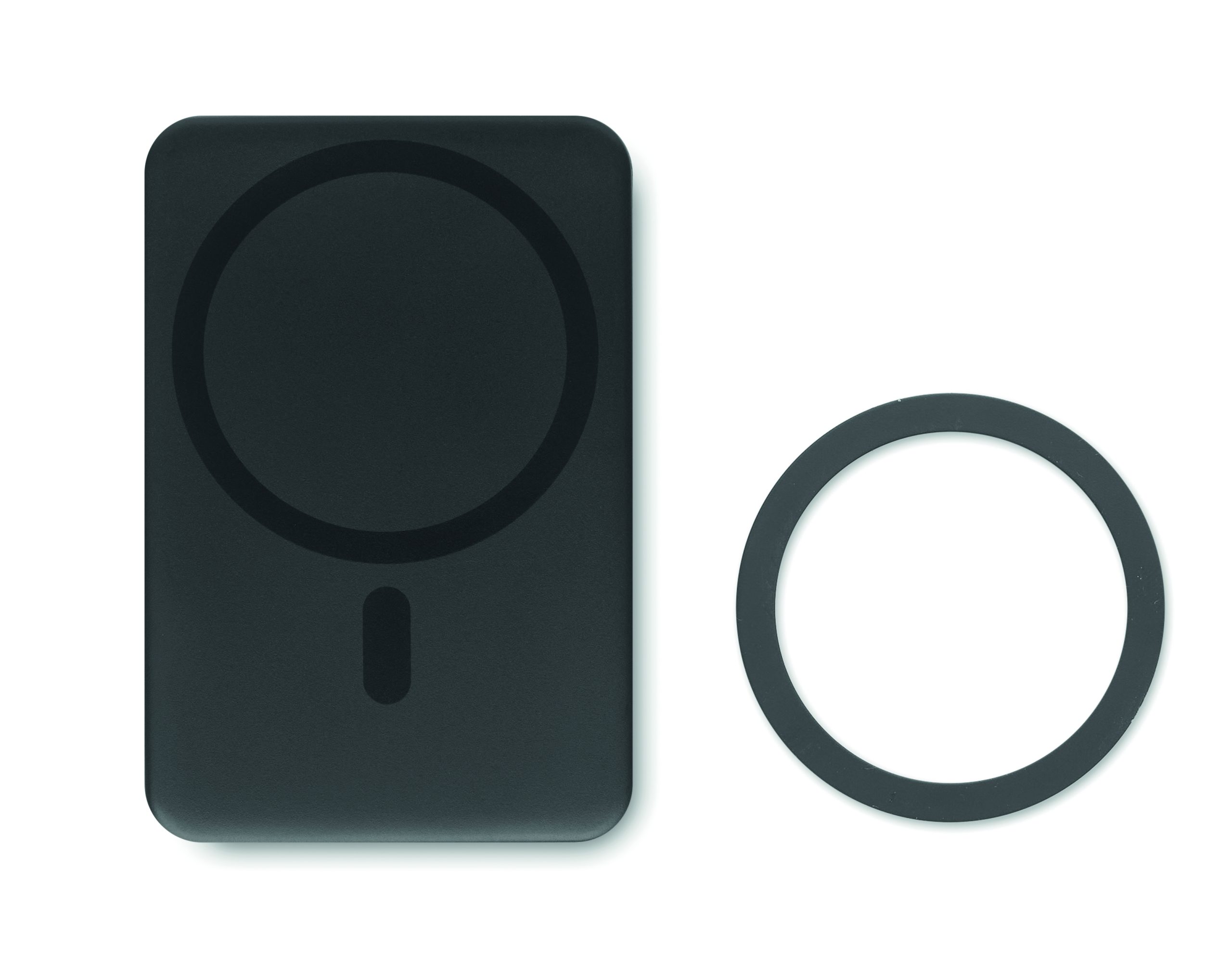 Magnetic wireless powerbank. 5000 mAh. ABS and stainless steel. PD up to 20W. Outputs: USB-C up to20W. Wireless charging up to 15W. Input: USB-C. Built-in USB-C cable. USB-C to USB-C cable with USB-A adapter and magnetic ring included.
