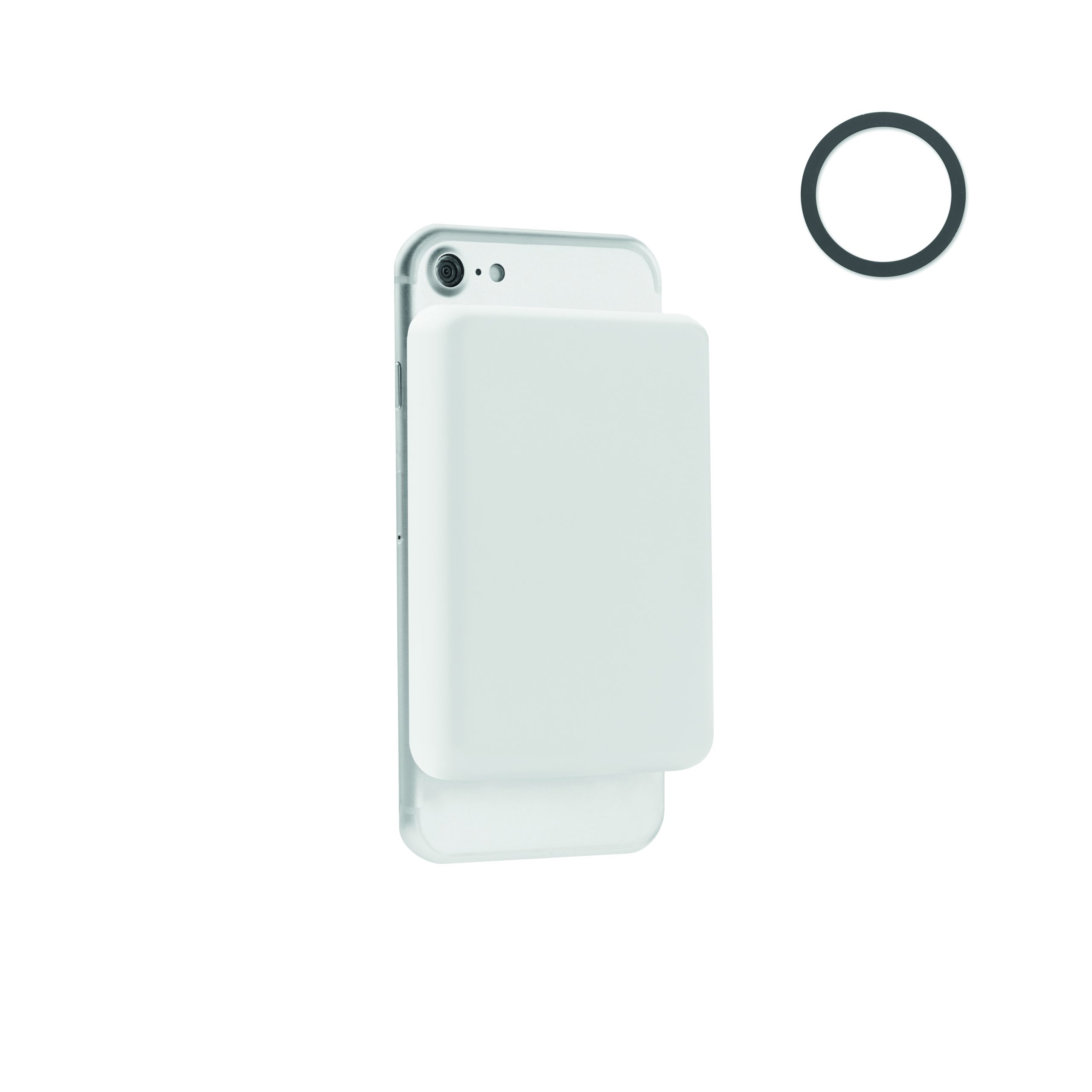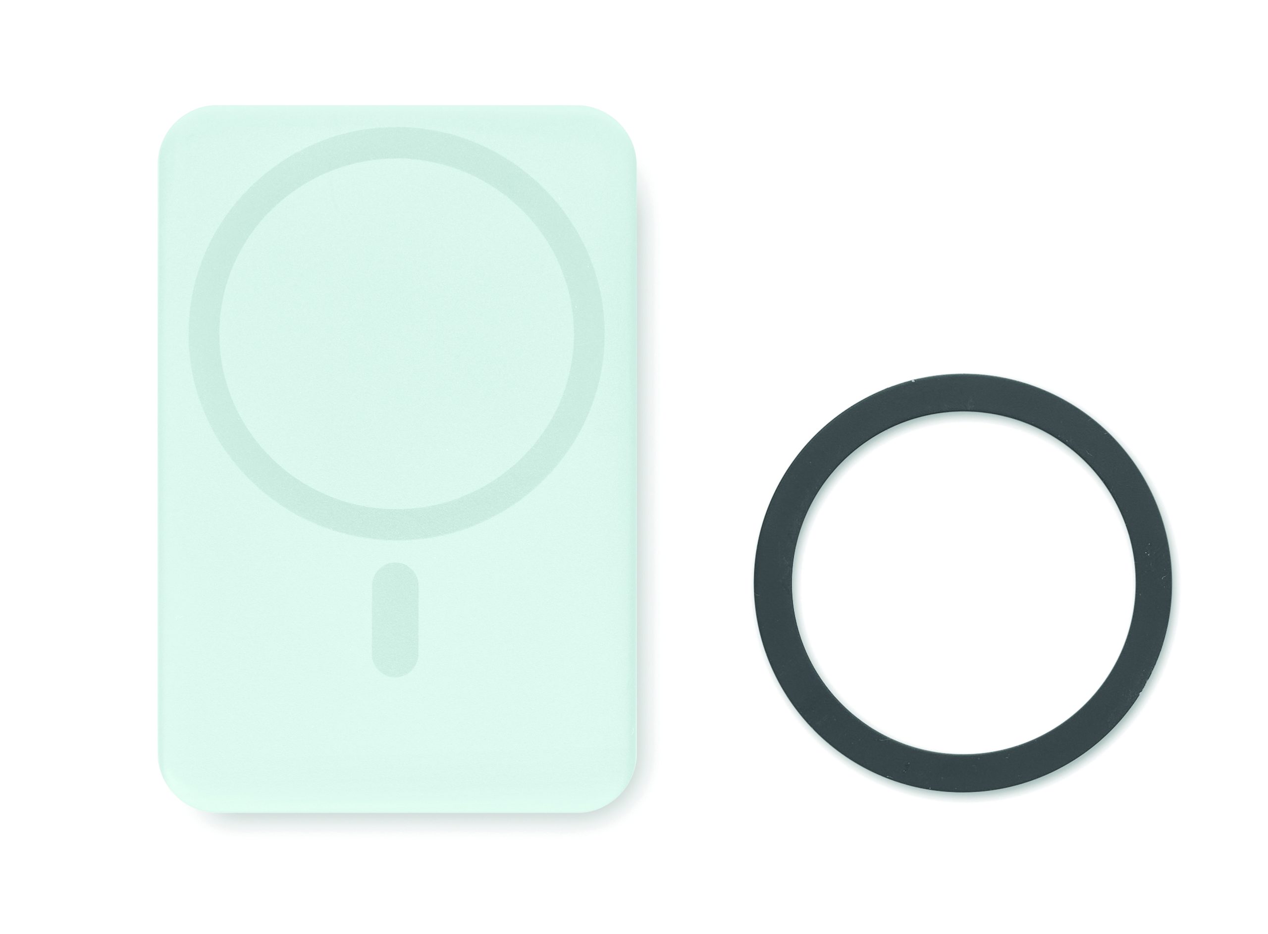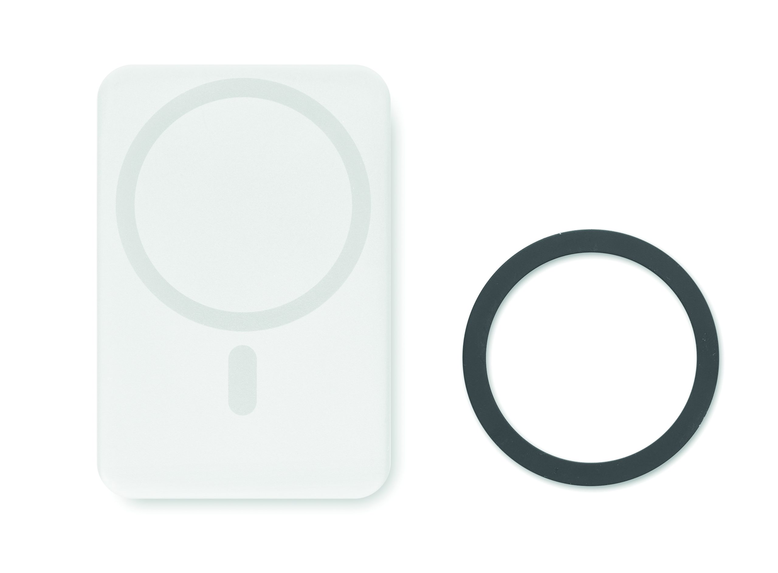 Magnetic wireless powerbank. 5000 mAh. ABS and stainless steel. PD up to 20W. Outputs: USB-C up to20W. Wireless charging up to 15W. Input: USB-C. Built-in USB-C cable. USB-C to USB-C cable with USB-A adapter and magnetic ring included.