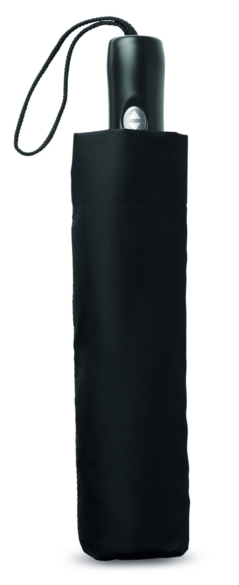 23 inch 3 fold auto open/close reversible umbrella in 190T pongee material chrome plating steel shaft. Fibre-glass rib and 1 part black plating inside frame. Black ABS handle with button. Includes matching pouch.