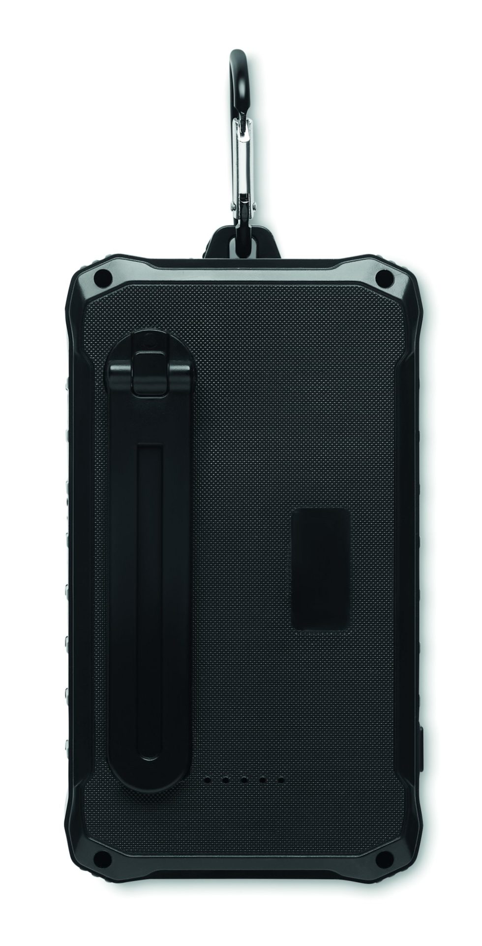 Solar powerbank. 8000 mAh. ABS. Outputs: USB-A up to 10W. Input: USB-C 10W. Solar input 5V/200mA. Crank handle and 100 lm LED light. USB-C to USB-C cable with USB-A adapter and carabiner included.