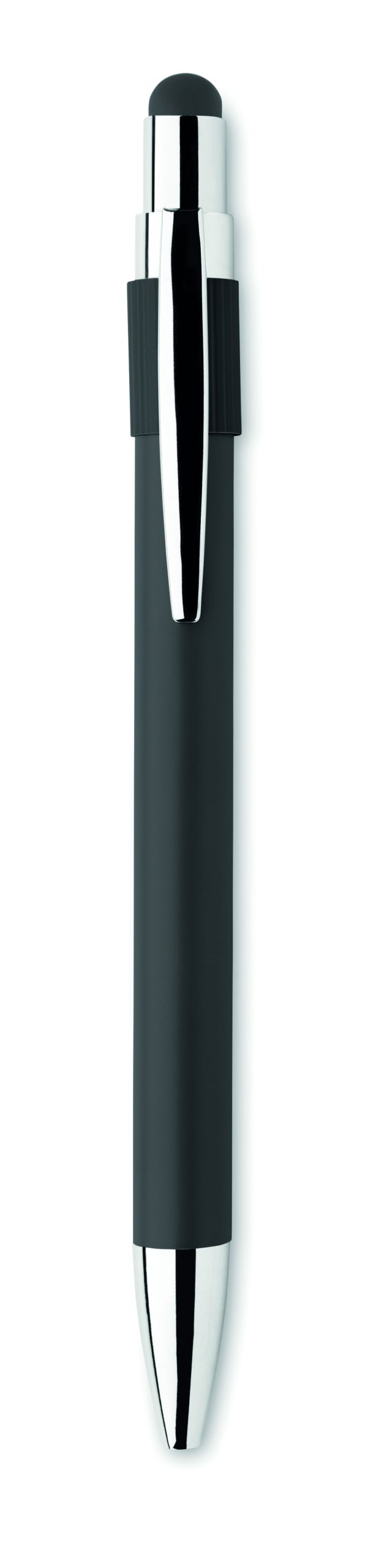 Stylus push ball spinner pen in recycled aluminium. Blue ink.