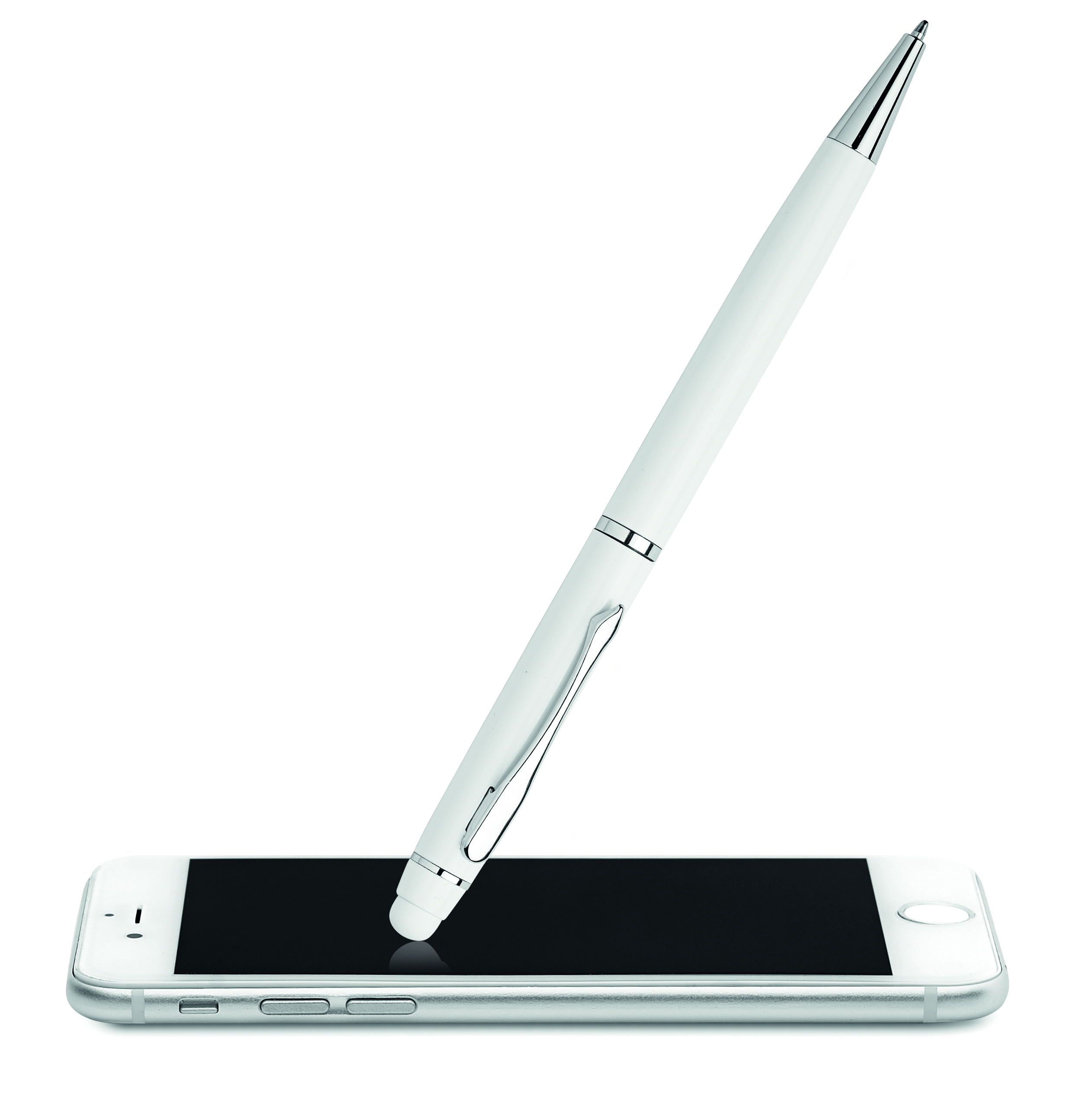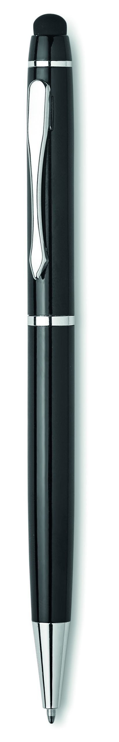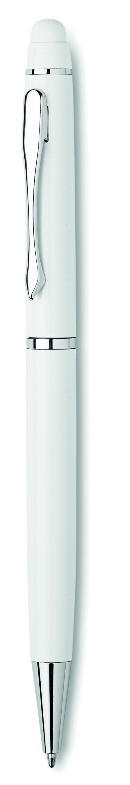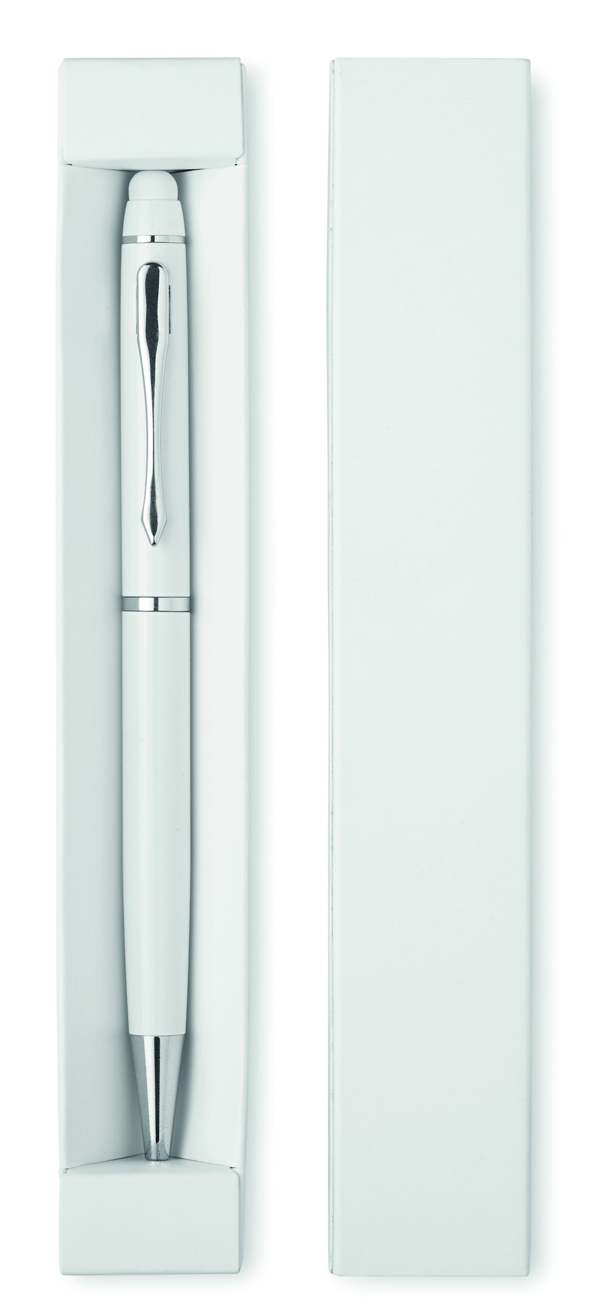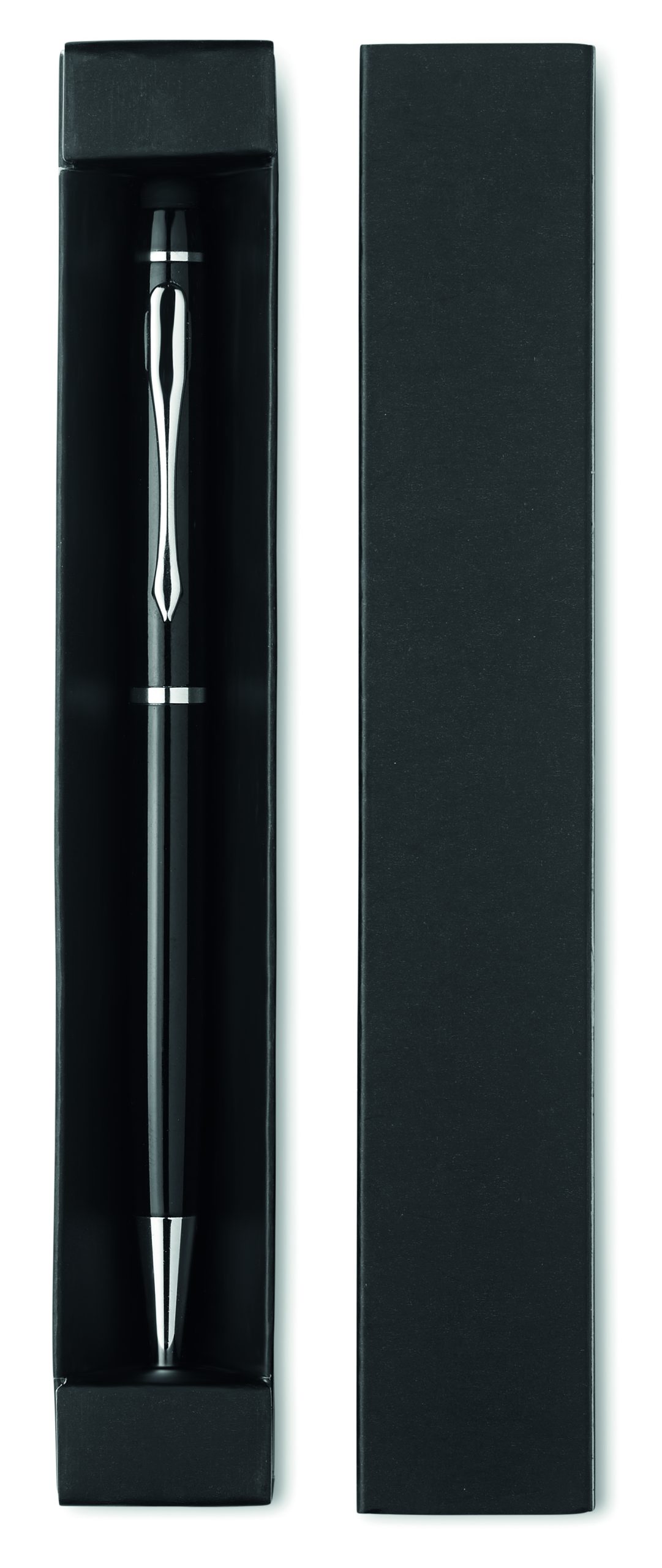 Twist action ball pen in aluminium twist stylus. Blue ink. Presented in paper box.