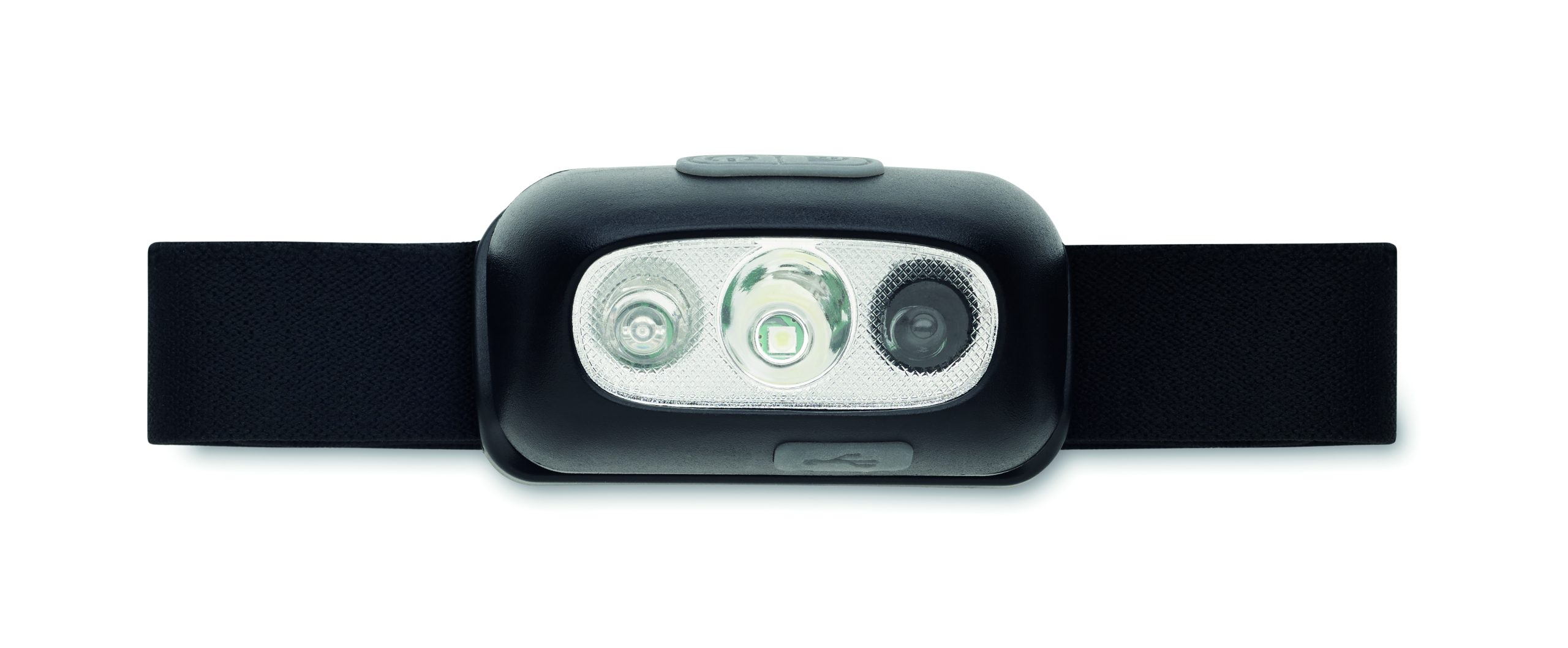 Rechargeable and adjustable head torch with 1 LED light (50 lumen) and 3 lightning modes. Built in 400 mAh rechargeable battery and including charging cable.