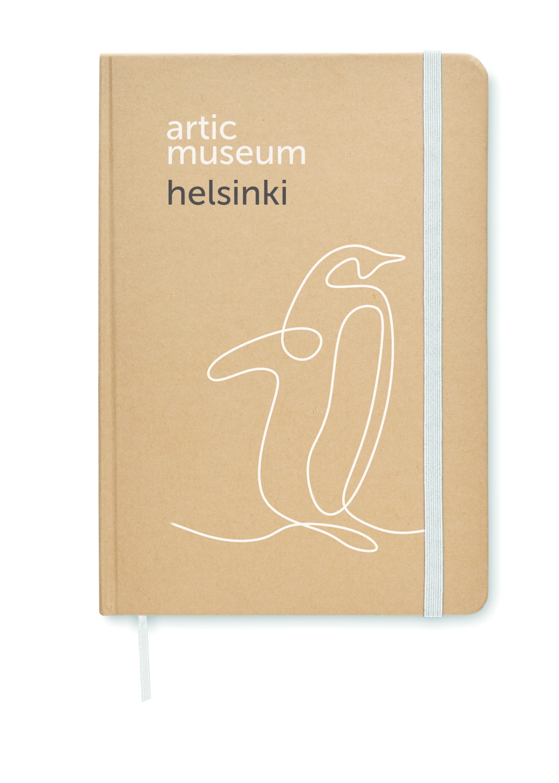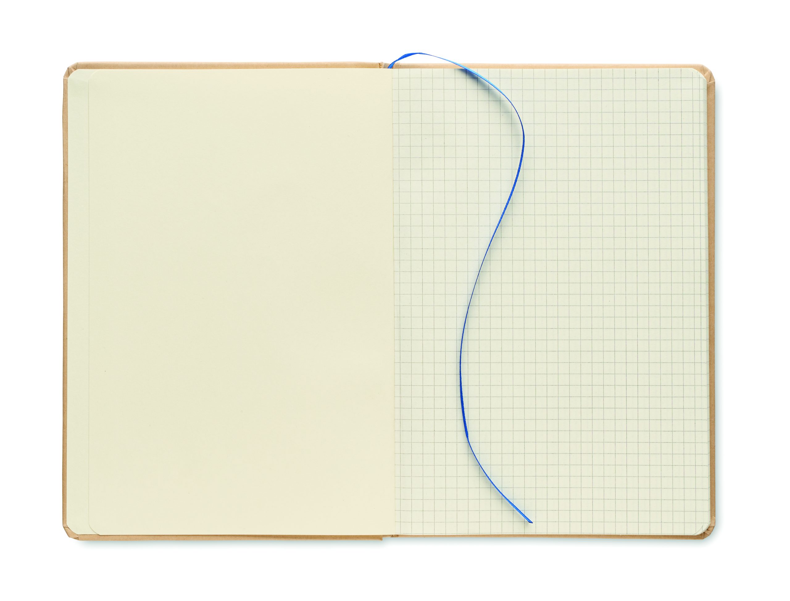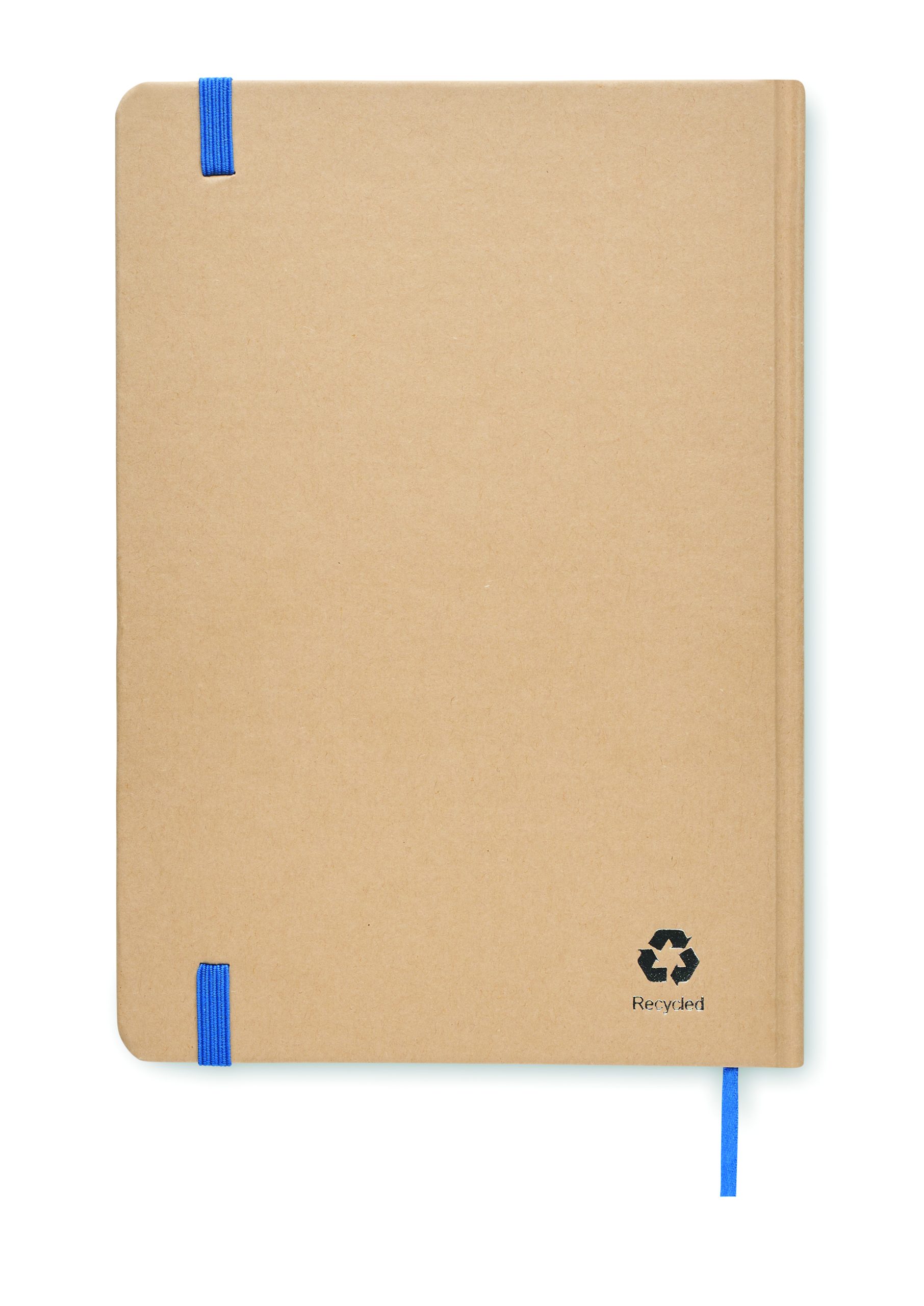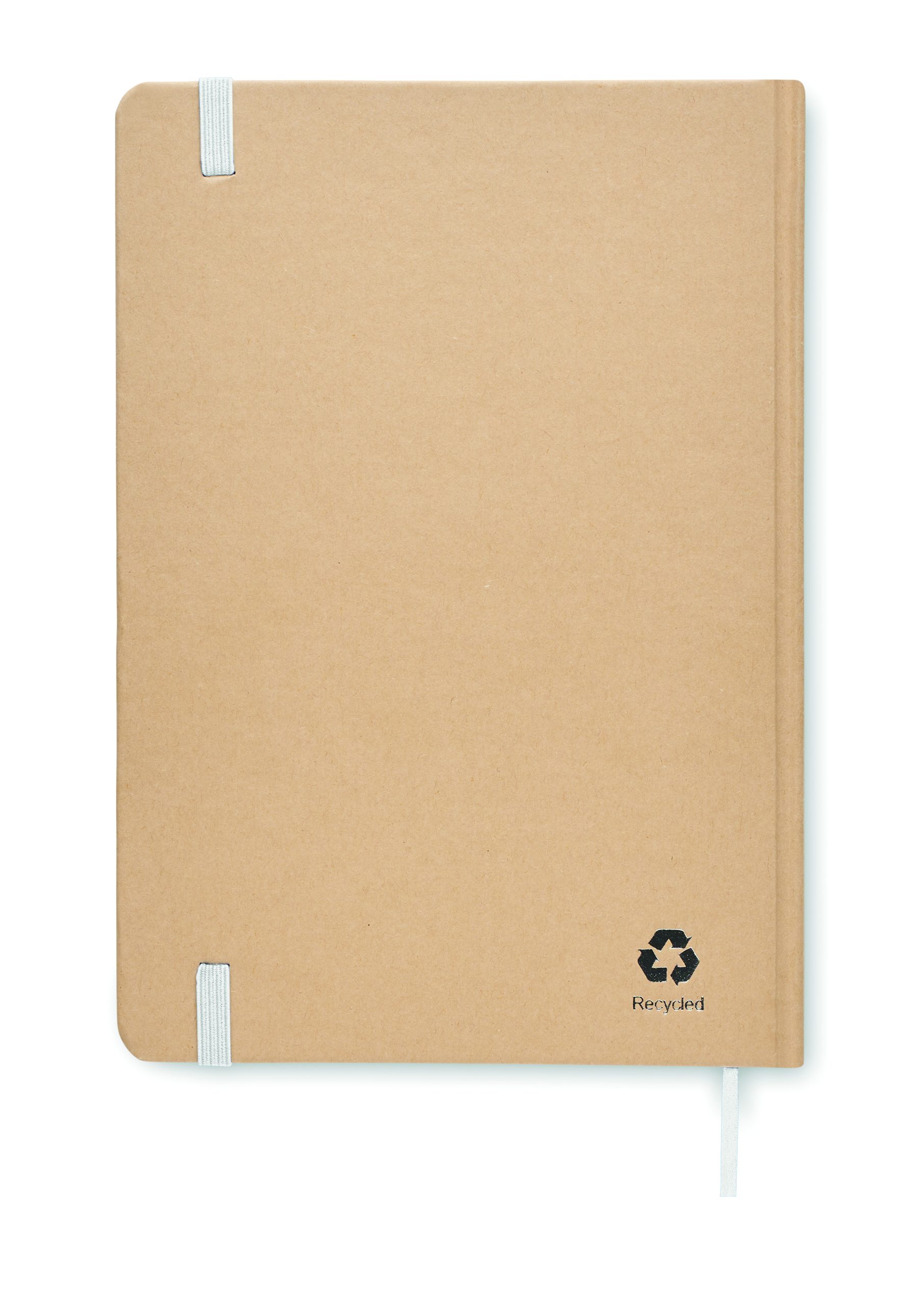 A5 notebook with hard recycled carton cover. Casebound. 160 squared recycled pages (80 sheets). Elastic closure strap, ribbon bookmark. FSC®-certified | FSC MIX CREDIT, P7.1, FSC-C213206