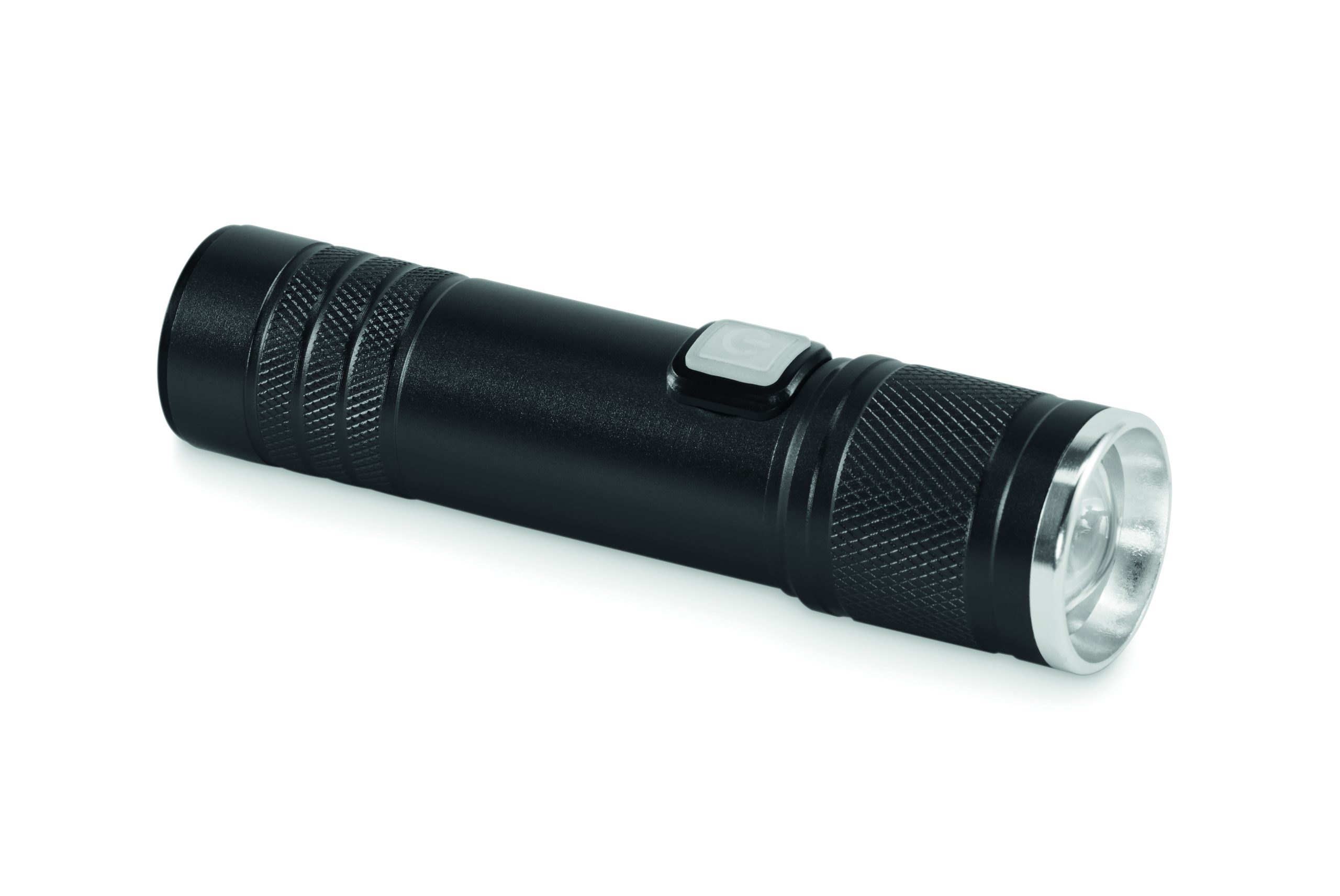 Rechargeable and expandable COB light torch in recycled aluminium. 100 lumen with 3 light settings and zoom function. Built-in 800 mAh rechargeable battery. Charging cable included.
