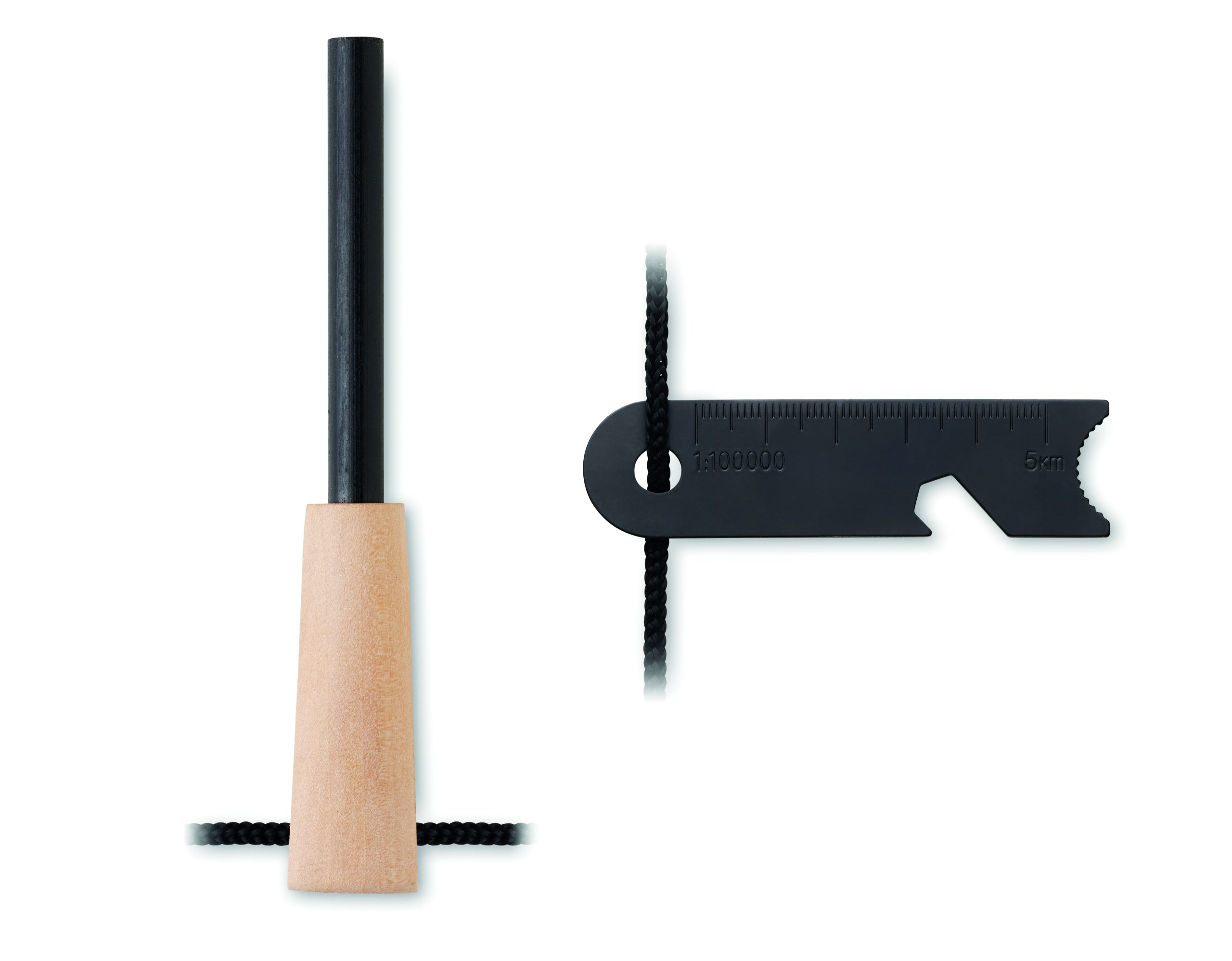 Fire starter tools in pine wood and stainless steel including a lighting stick, a multi-purpose scraper to use with your fire starter, bottle opener, precision ruler and hex key.