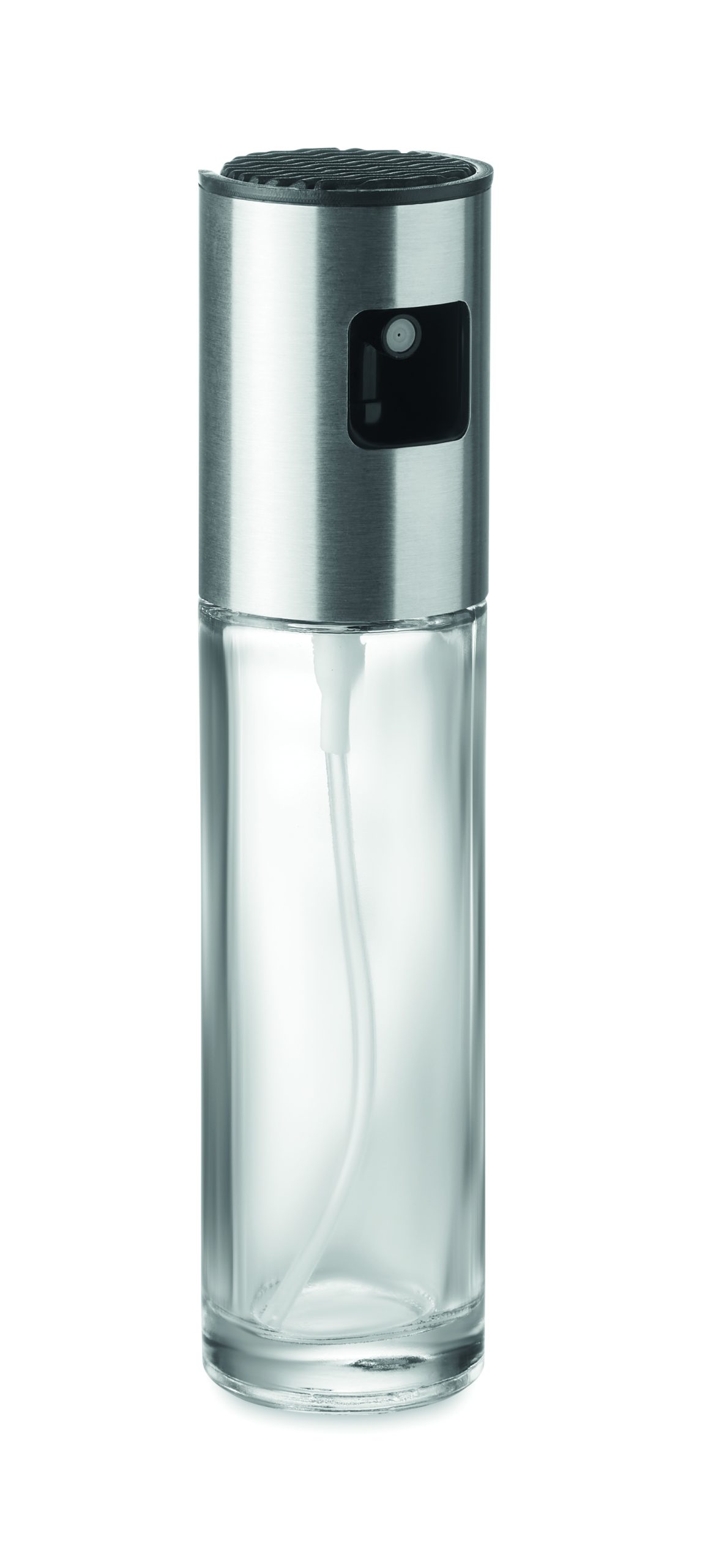 Glass oil dispenser spray with stainless steel lid. Capacity: 100 ml.