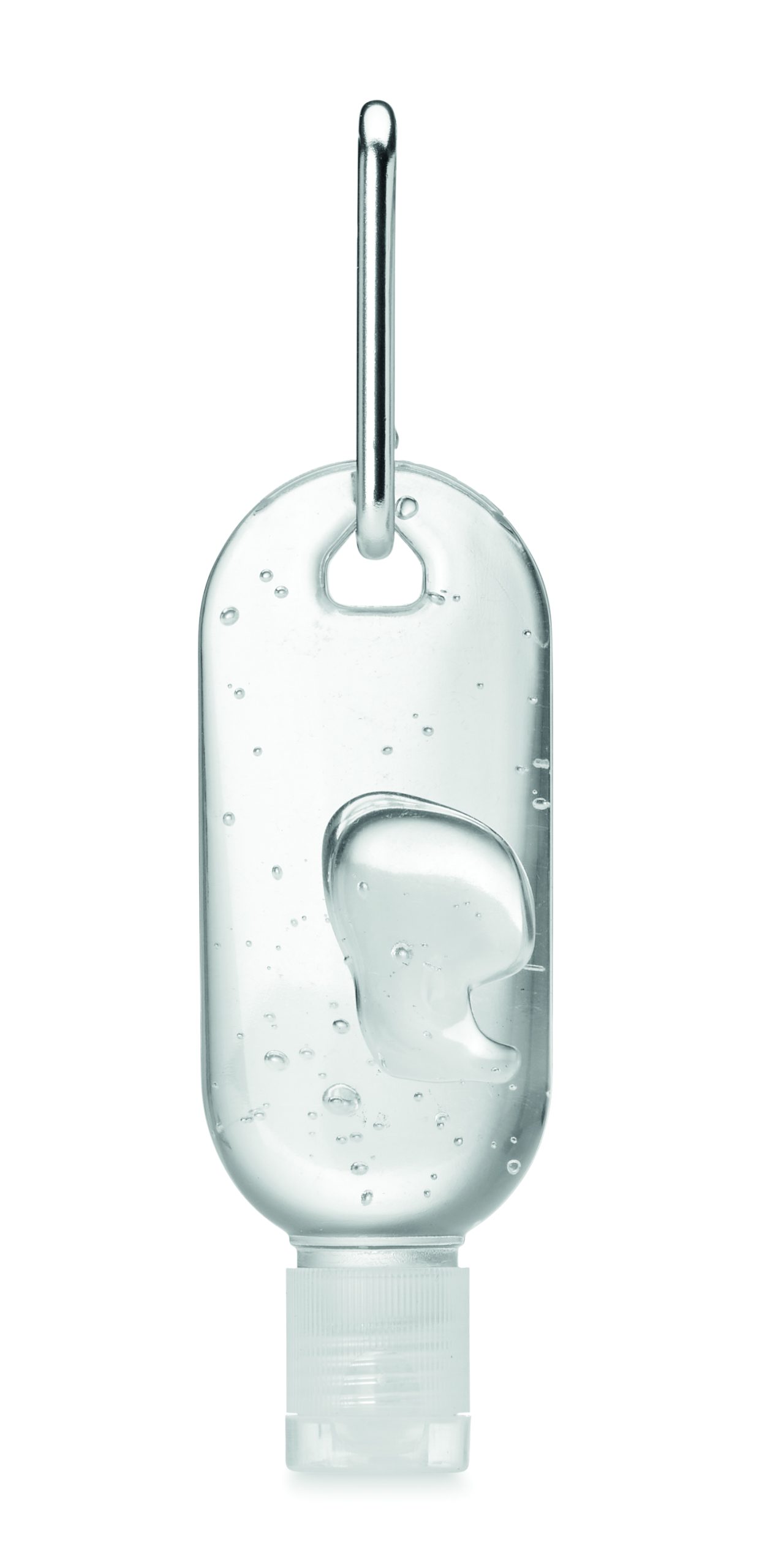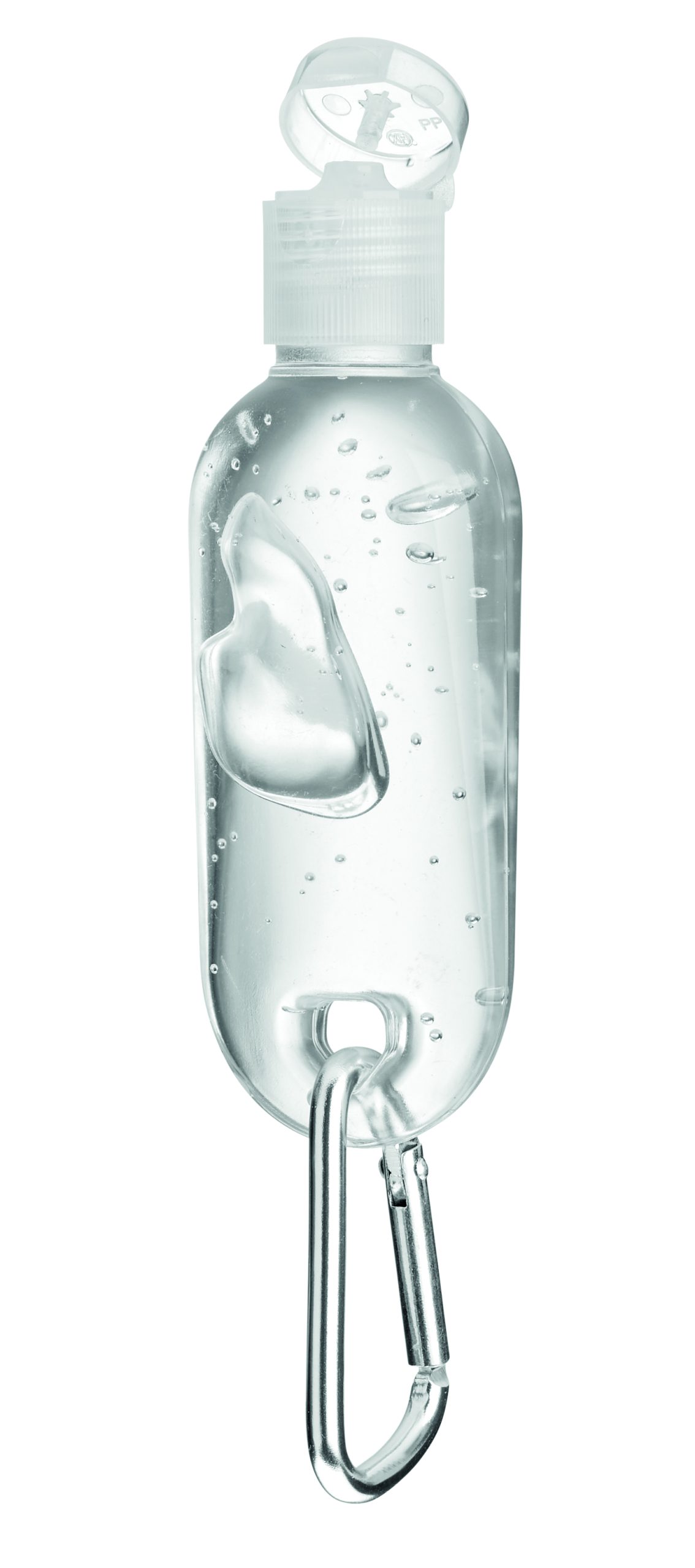 Hand cleanser gel in PET refillable bottle with flip cap and carabiner. Non-alcohol formulation. Capacity 30 ml.