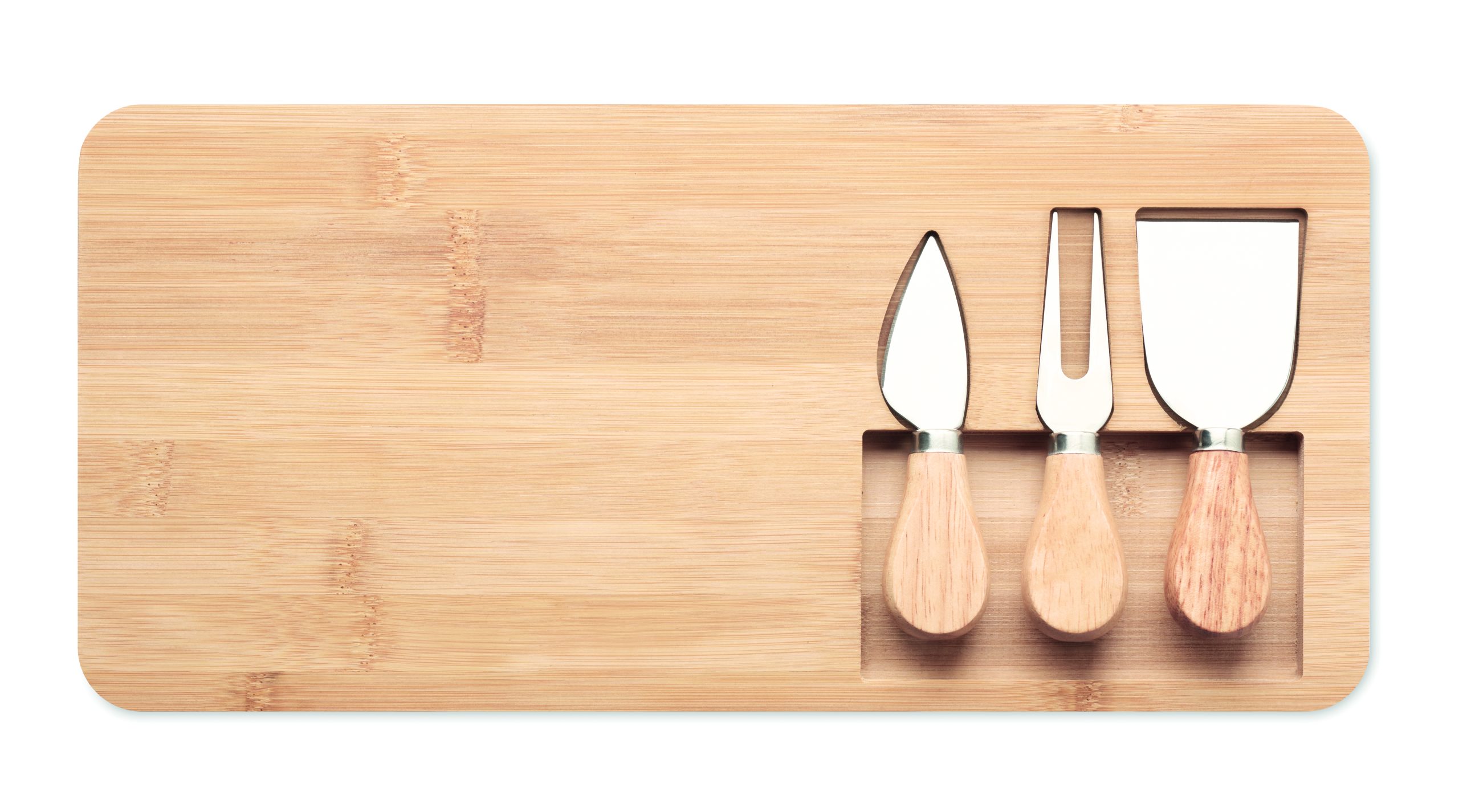 Bamboo cheese set with a serving board, 2 serving knives and a fork. Present a cheese platter in style with this natural looking wooden board and matching utensils. Can also be used to serve other types of food and snacks at parties or at a dinner. Bamboo is a natural product, there may be slight variations in colour and size per item, which can affect the final decoration outcome. FSC®-certified | FSC 100%, N5.7, FSC-C213206