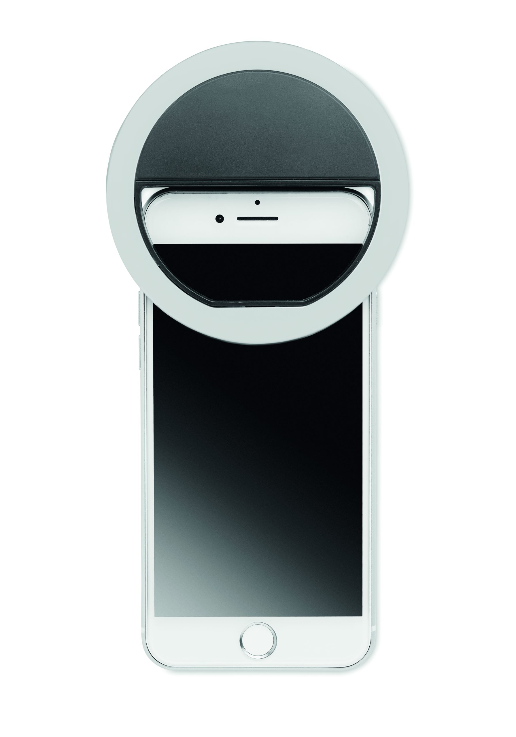 8 cm portable selfie ring light in ABS material with 28 LED’s. White light adjustable to 3 different brightness levels. USB rechargeable 80 mAh battery.