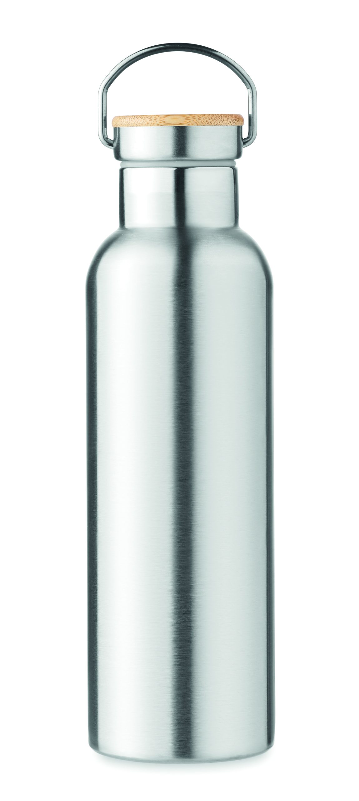 Double wall Stainless Steel insulating vacuum flask with bamboo lid and carry handle. Capacity: 750 ml. Leak free. Bamboo is a natural product, there may be slight variations in colour and size per item, which can affect the final decoration outcome.