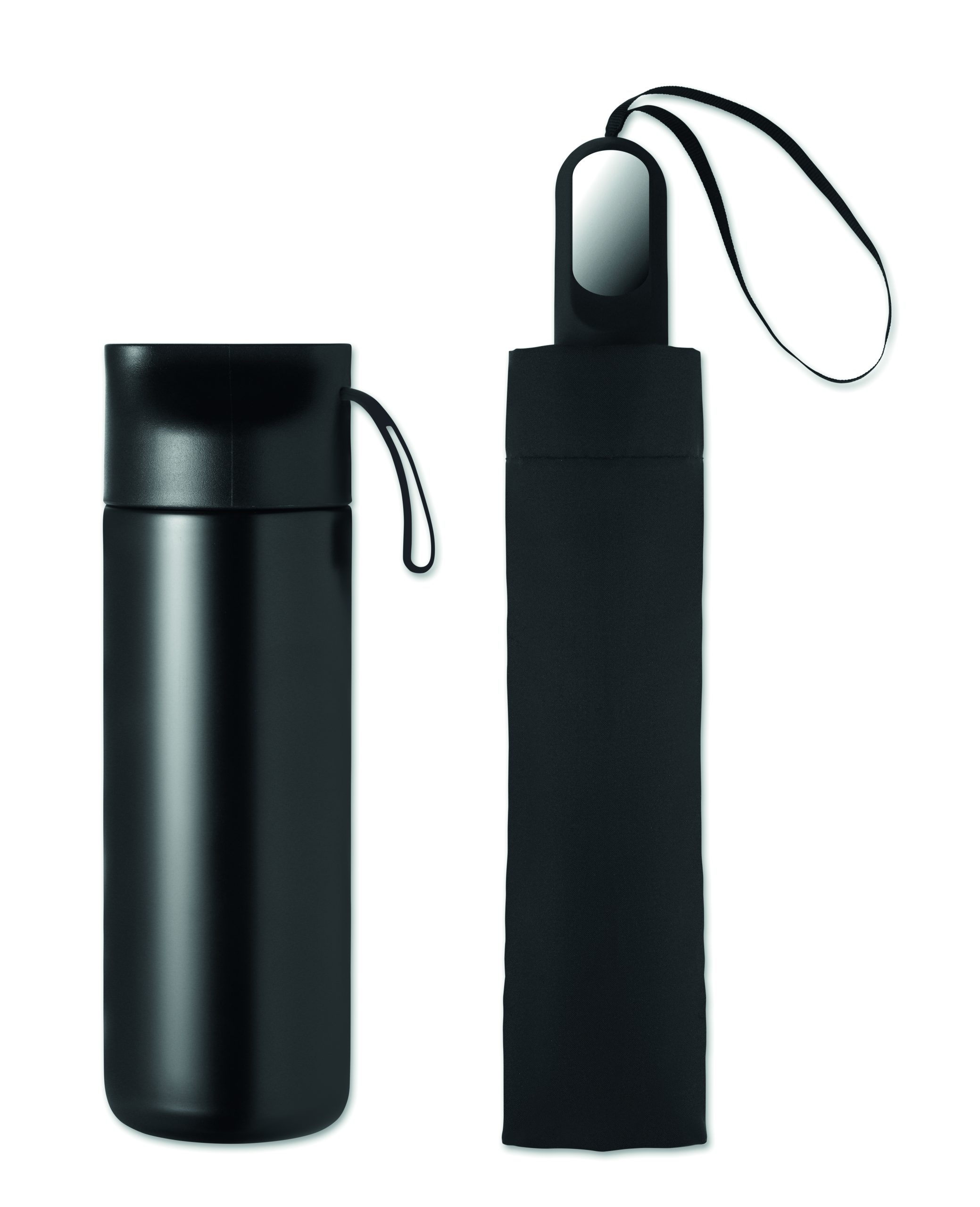 2-piece gift set with 600 ml double wall recycled stainless steel bottle with PP lid, metal detail, and silicone handle, plus 21″” foldable windproof pongee umbrella with ABS handle in gift box.