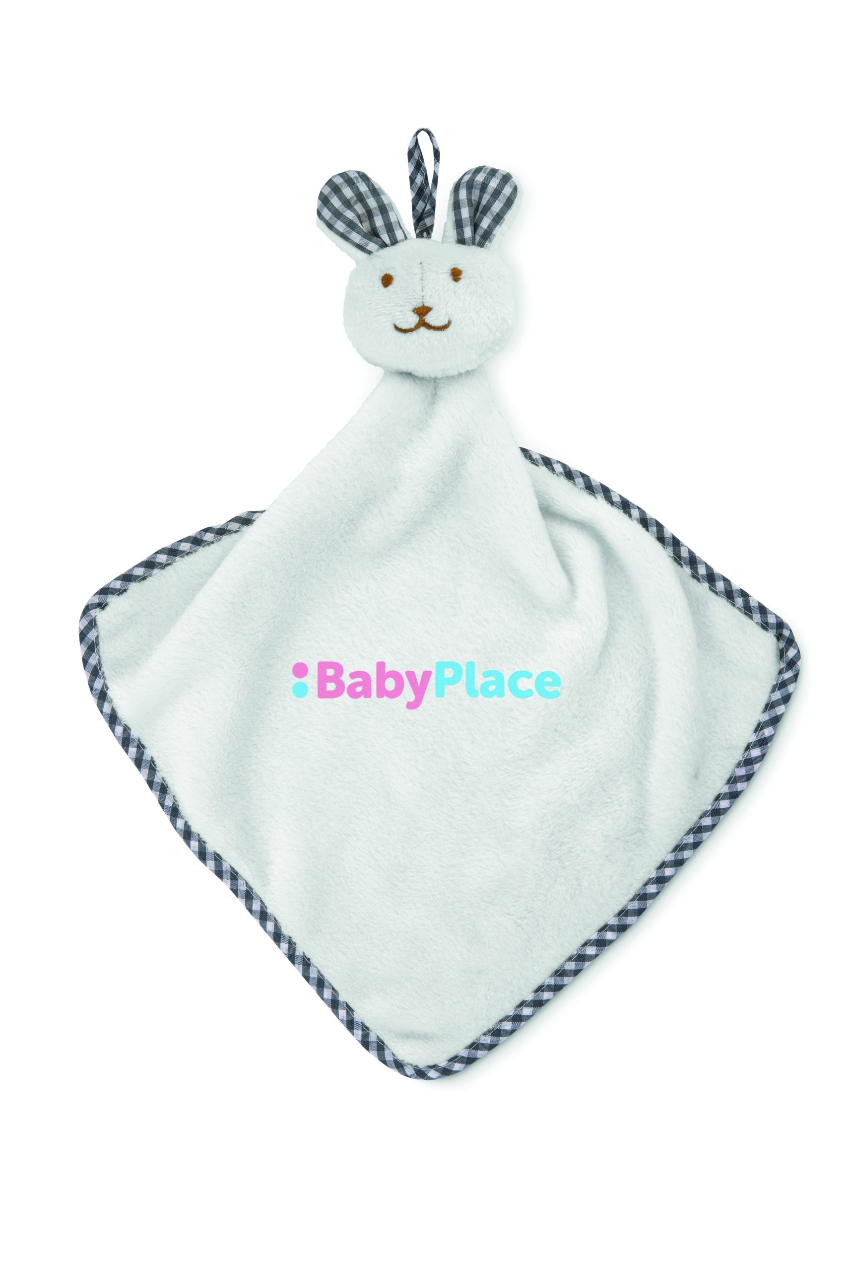 Plush baby towel in velvet polyester with rabbit design on the top. 180gr/m².