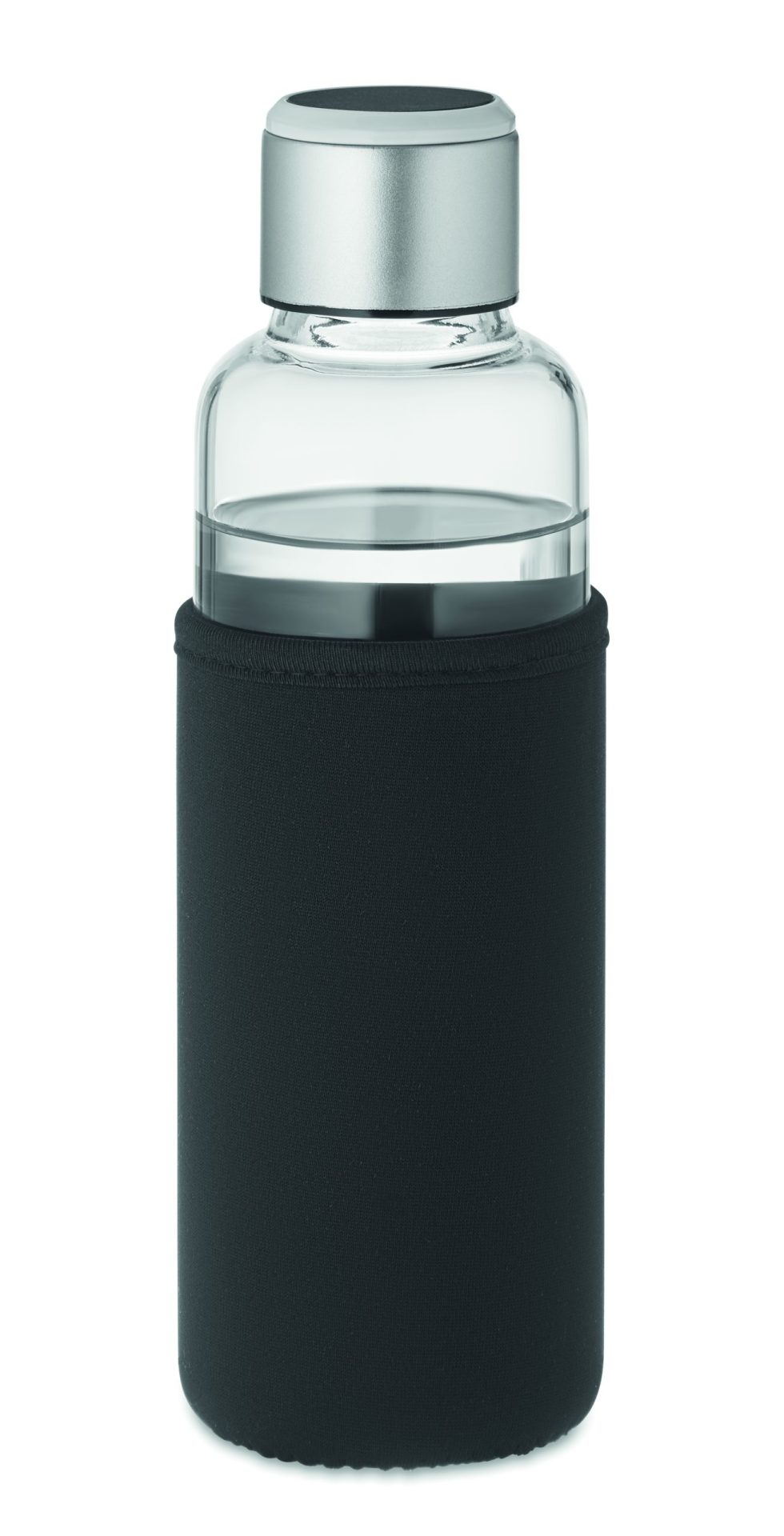 Borosilicate glass steel bottle with hydration reminder in pouch. Sensor light glows every hour reminding you when it is time to drink. Including 1 CR2032 battery. Capacity: 500 ml.