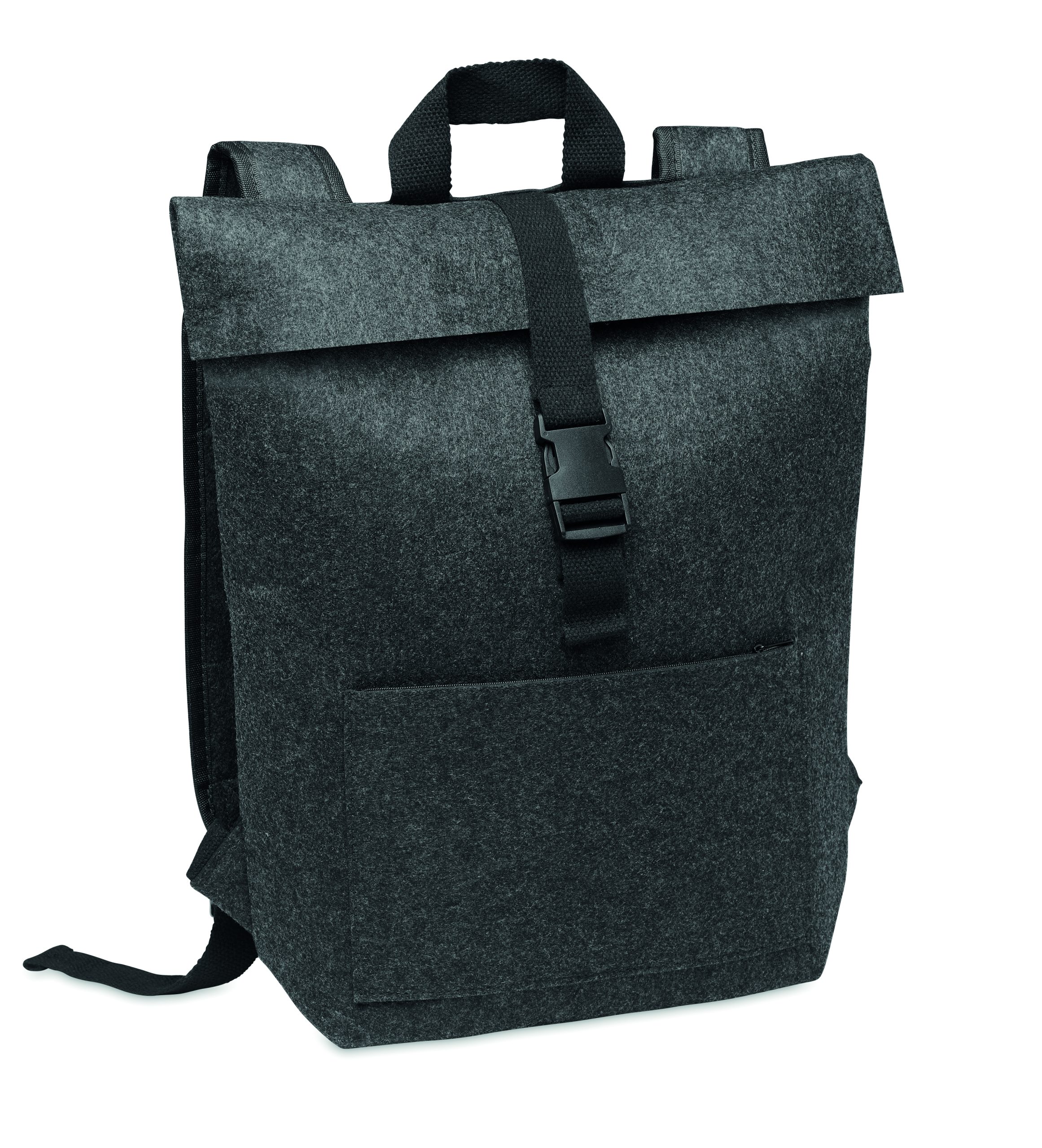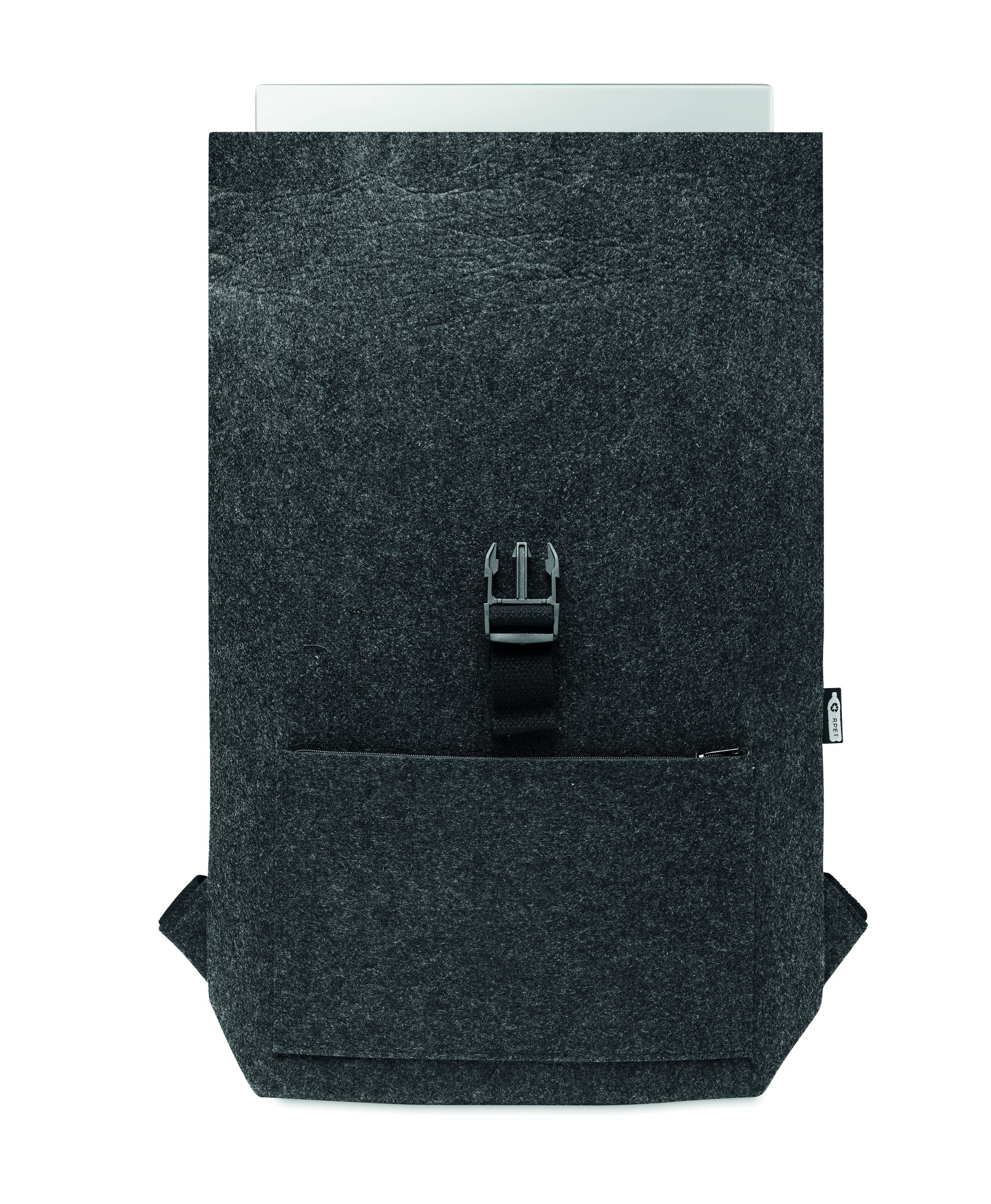 RPET felt backpack with cotton strap closure and zippered pocket on the front. It has a laptop compartment.