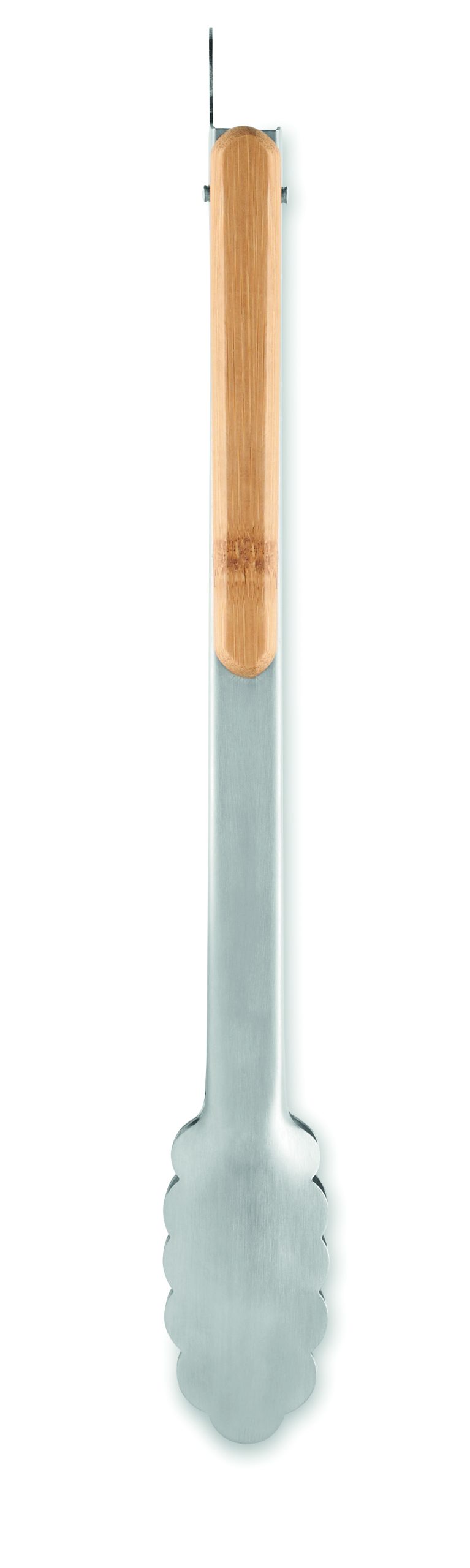 Stainless steel barbecue tongs with bamboo grips. Locking mechanism. Bamboo is a natural product, there may be slight variations in colour and size per item, which can affect the final decoration outcome.