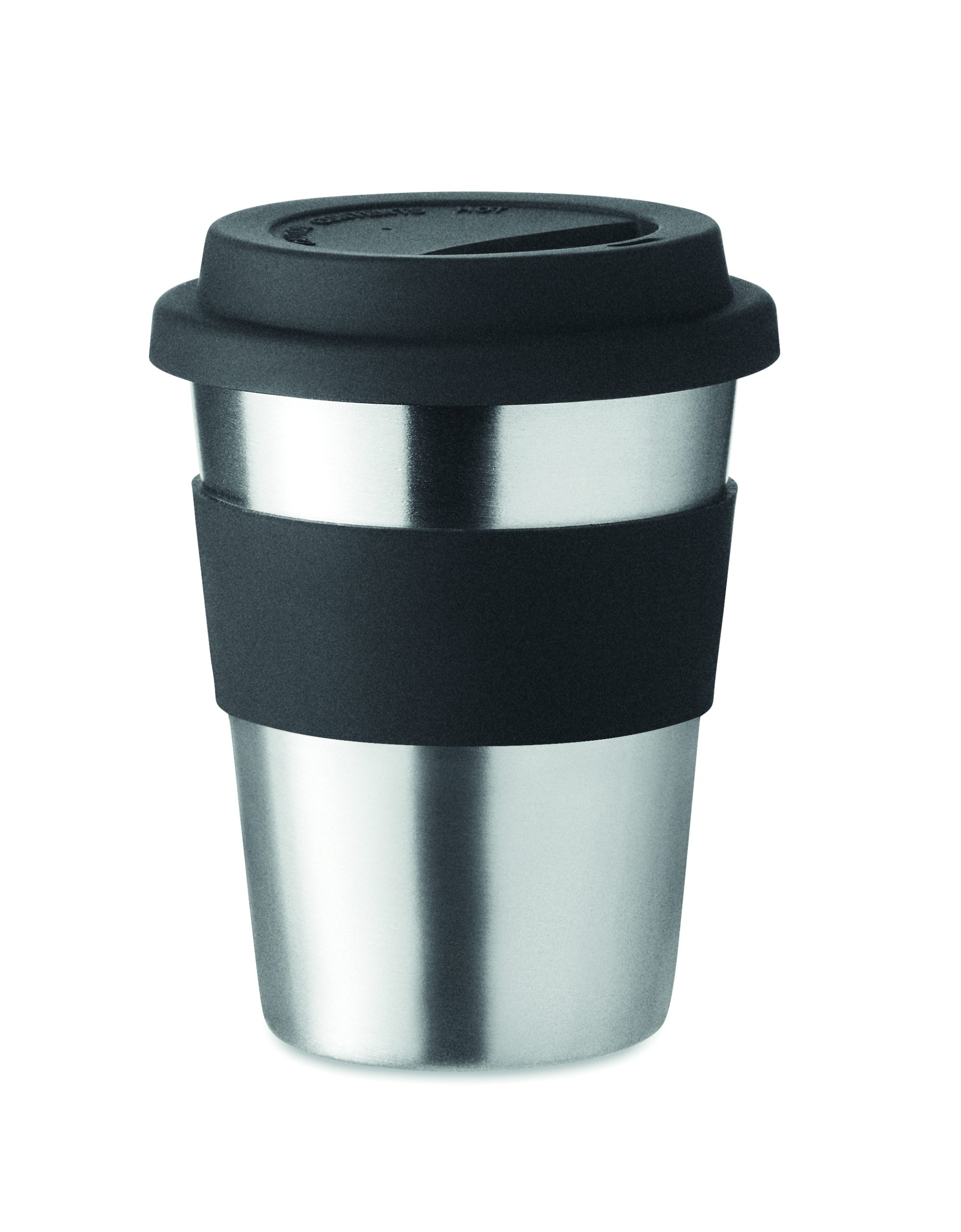 Stainless steel single wall tumbler with silicone lid and grip. Capacity 350 ml. As this is a single walled mug heat transfer can still occur.