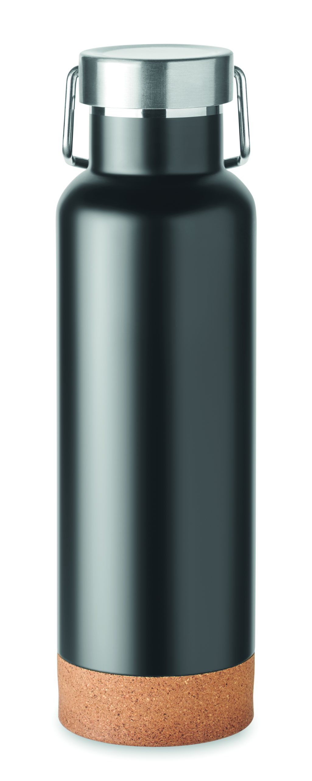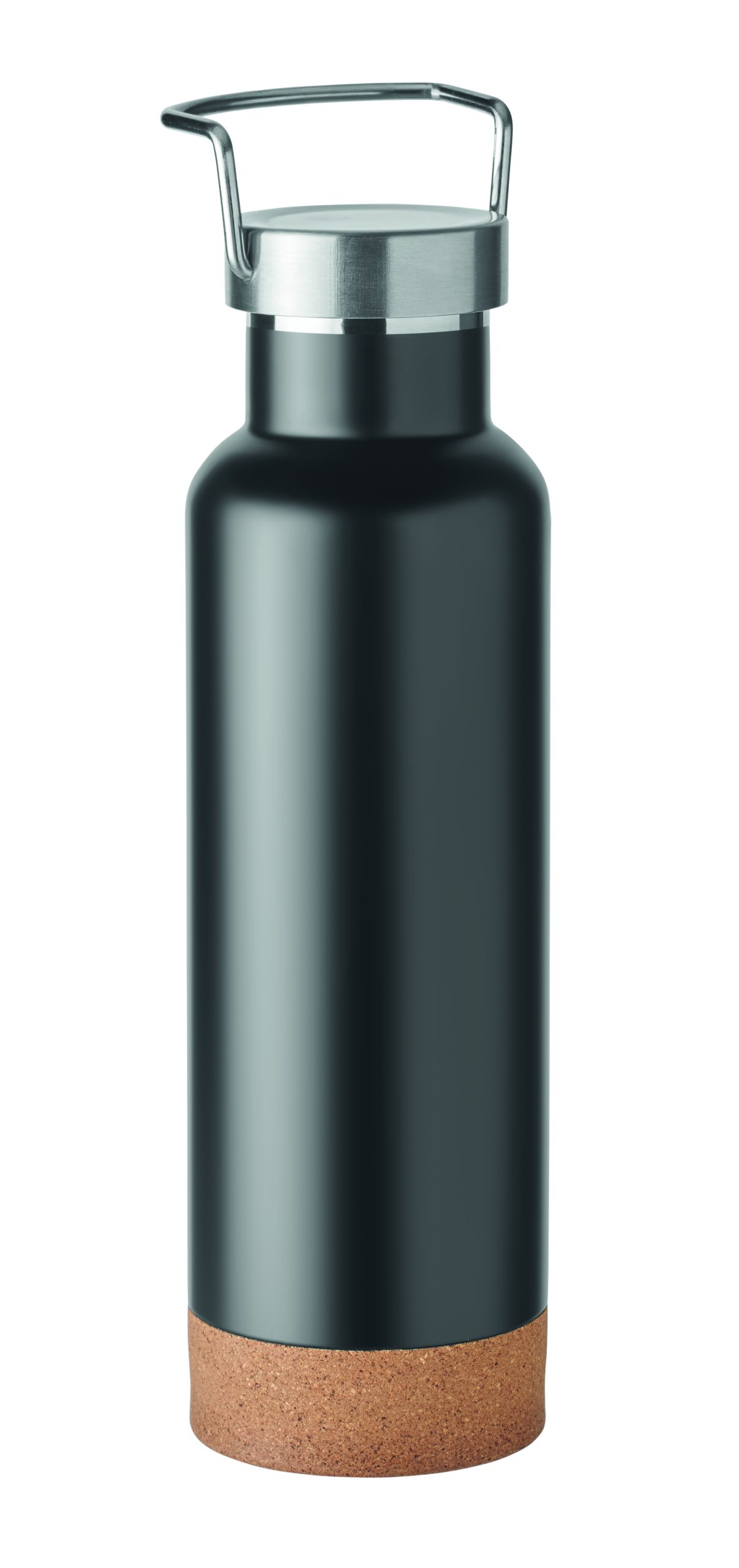 Double wall vacuum insulated flask in recycled stainless steel, the lid has a carry handle and a cork detail base (90% recycled stainless and 10% stainless steel). Leak-free. Capacity: 500 ml.